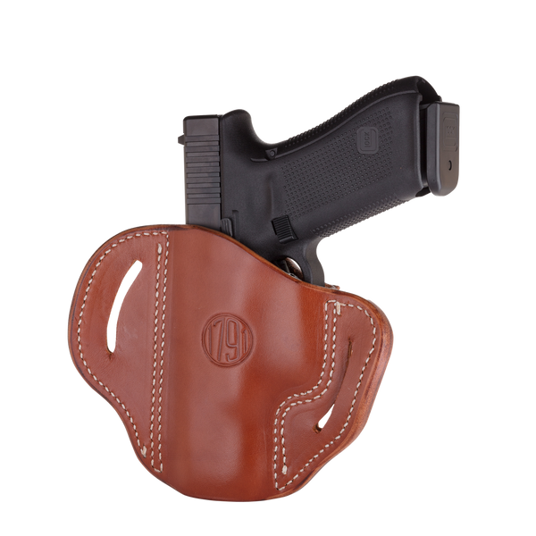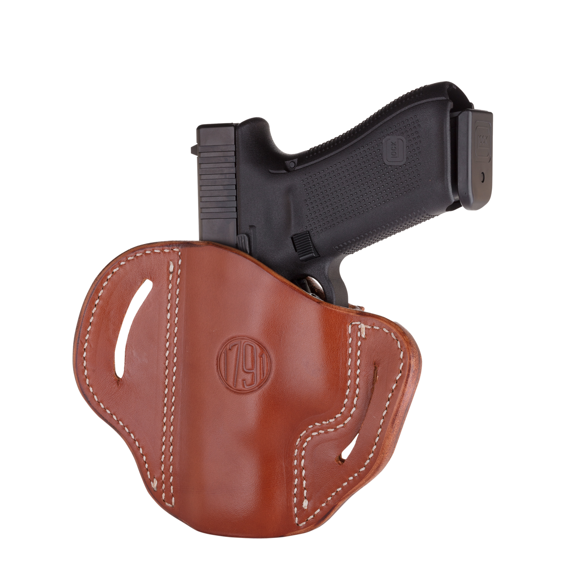 The 1791 gunleather open top multi-fit belt holster 2.4 offers retention for a wide range of firearms.Focusing on the full frame firearms ranging from 4-5".The bh2.4 has become a favorite for law-enforcement officials and off-duty military, with its ability to carry the m17 and m9's of the world.It features an open top design for quick draw, multi-fit design to accommodate a wide range of firearms, and 100% certified american, heavy native steerhide leather with reinforced stitching to ensure quality, security, and a lifetime of enjoyment.The optic ready belt bh2.4 includes an added optic cut to accommodate most pistol optics.Additionally, the sweat guard will protect your gun from tarnishing and will act as a comfortable barrier between you and your hammer preventing any gouging into your side.The paddle is adjustable and allows for quick on and off while ensuring proper retention.Compatible with beretta 92, 92fs, 92x, m9; canik tp9sf; cz 75/75b, p09, p10f, shadow 2; fn fn5.7, fns 9 longslide, 40 longslide, fnx 45; h&k hk 45, p30l, usp tactical, vp tactical, vp 40; ruger american, p85, p90; s&w m&p 10mm m2.0 4.6"; sig sauer m17, p220, p226, p226r, p227, p320, p320 tacops; springfield xdm 4.5 & 5.25"; taurus pt92, th9; walther pdp 4.5", pdp 5", ppq, ppq 45, ppq q4 tactical, wmp and similar frames.