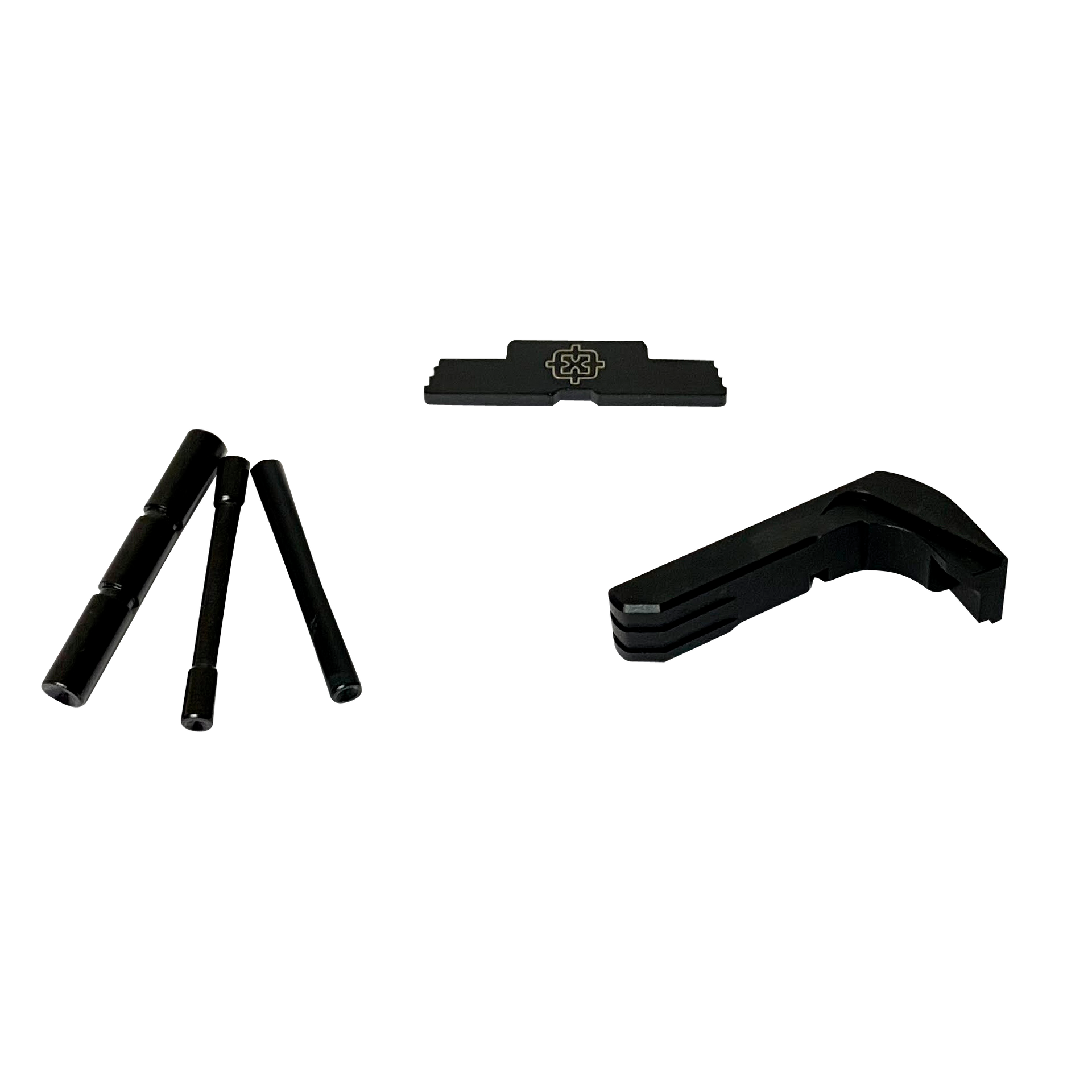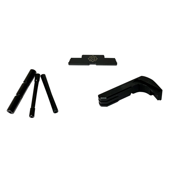 Cross armory glock 3 piece kit contains dimpled pin set, extended magazine catch and extended slide lock.The slide lock and pin set is made of 4140 steel, the magazine catch is made of aluminum.Does not interfere with gun holster.Fits glock 17/19/26/34 gen5.
