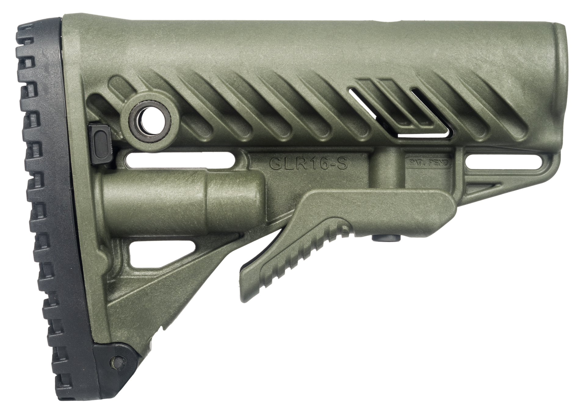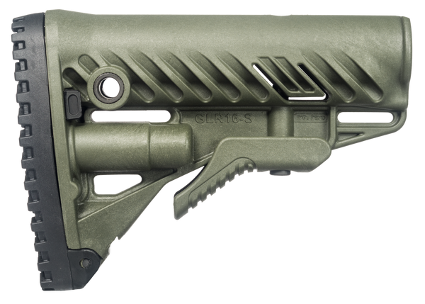 The glr-16 buttstock for your ar15/m16 provides you with enhanced versatility with it's stock extension and uniquely designed rubber butt pad for fast and stable shoulder positioning.Its unique patented "anti-rattle" mechanism, fits perfectly on mil-spec and commercial after-market buffer tubes.Made from fiberglass reinforced polymer composite, the stock features three integrated slots for sling attachment, one in the front and two at the rear and water-resistant anti rattle storage compartment for two cr123 or aa batteries.This model has an od green finish.
