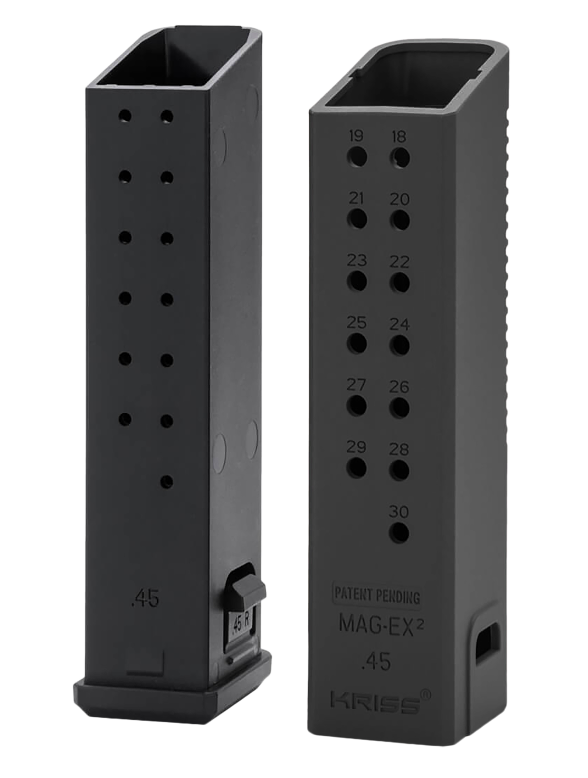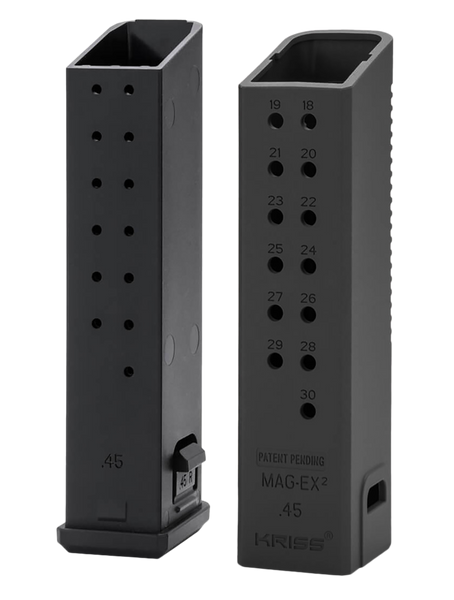 The kriss mag-ex kit 2 is the capacity extending base plate for your factory standard glock magazines.The kit is made up of the extended baseplate, outer sleeve and extended spring, constructed of durable and lightweight reinforced composites.Combining the mag-ex kit 2 with the factory standard glock magazine body and follower is a perfect match of reliable feeding, toughness and aesthetics for the kriss vector.