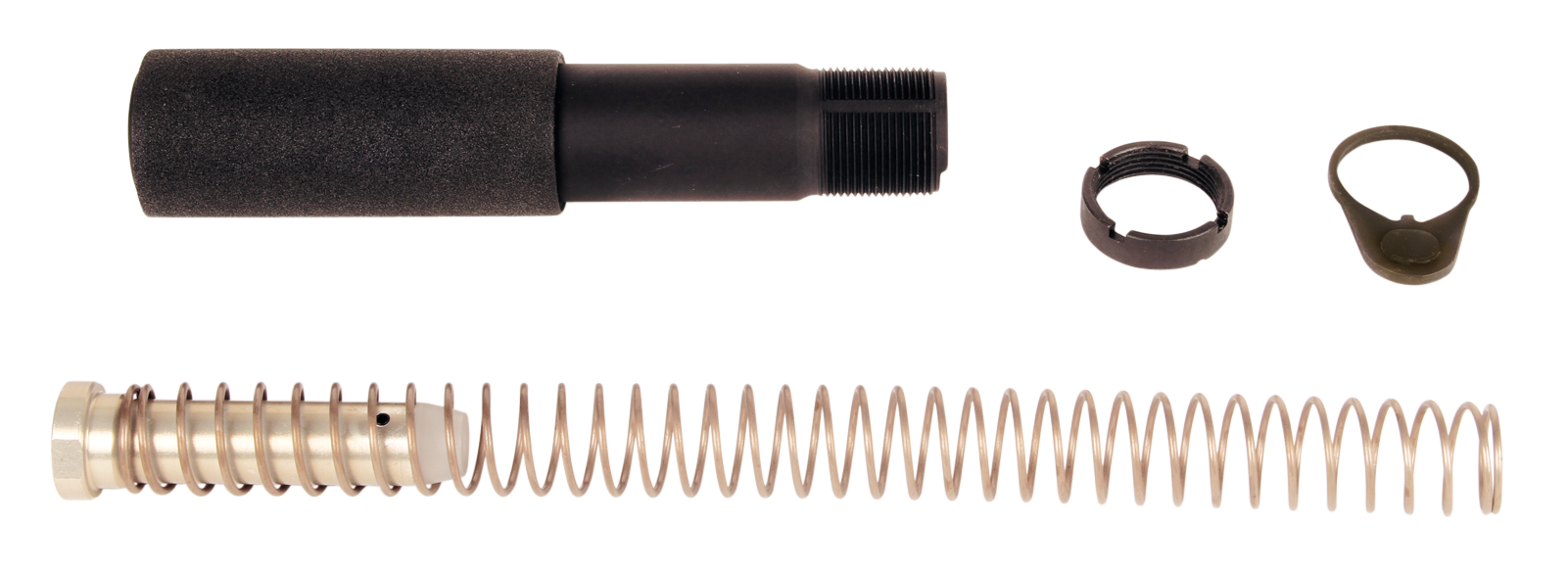 The lbe pistol buffer tube kit includes: pistol buffer tube; castle nut; receive end plate; carbine length recoil spring; standard carbine length recoil buffer.All parts are made in the usa.