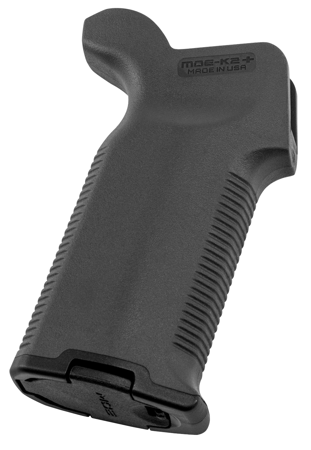 Made in the usa, the moe-k2+ grip combines reinforced polymer body construction with comfortable, wrap-around rubber overmolding for maximum weapon control in adverse environments.Similar in concept to the smaller moe-k, the moe-k2 is a drop in upgrade for ar15/m4's that offers a more vertical grip angle, but in a full-size grip design.The steeper vertical grip angle is optimized for use on pdw (personal defense weapon) configurations and improves comfort and control on short lop rifles that bring the primary hand in closer to the shooter's body.With the rubber overmolding for positive weapon control, compatibility with optional storage cores for gear stowage, and a unique backstrap design for proper trigger finger placement, the k2+ brings modern styling, ergonomics, and comfort to the ar platform.All mounting hardware and a basic grip cap included.
