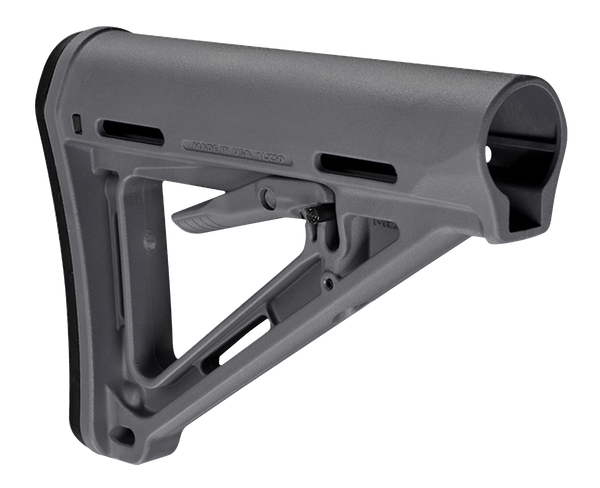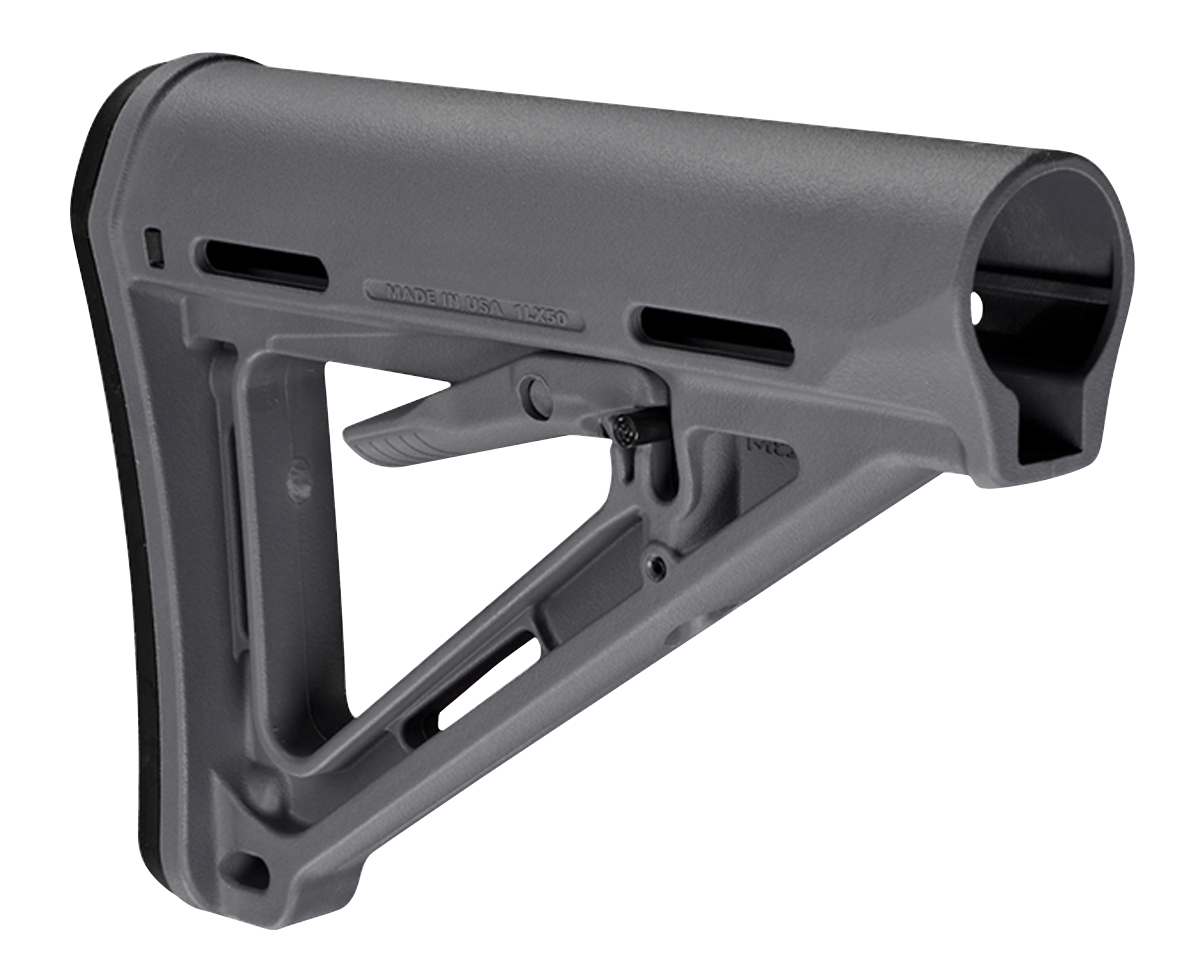 Made in the usa, the moe stock mil-spec model (magpul original equipment) is a drop-in replacement buttstock for ar15/m16 carbines using mil-spec sized receiver extension tubes.Designed for light, fast action the streamlined a-frame profile avoids snagging and shields the release latch to prevent accidental activation.The mil-spec model includes a standard 0.30" thick rubber butt-pad which provides positive shoulder purchase to prevent slippage even with body armor or modular gear.