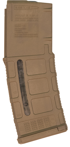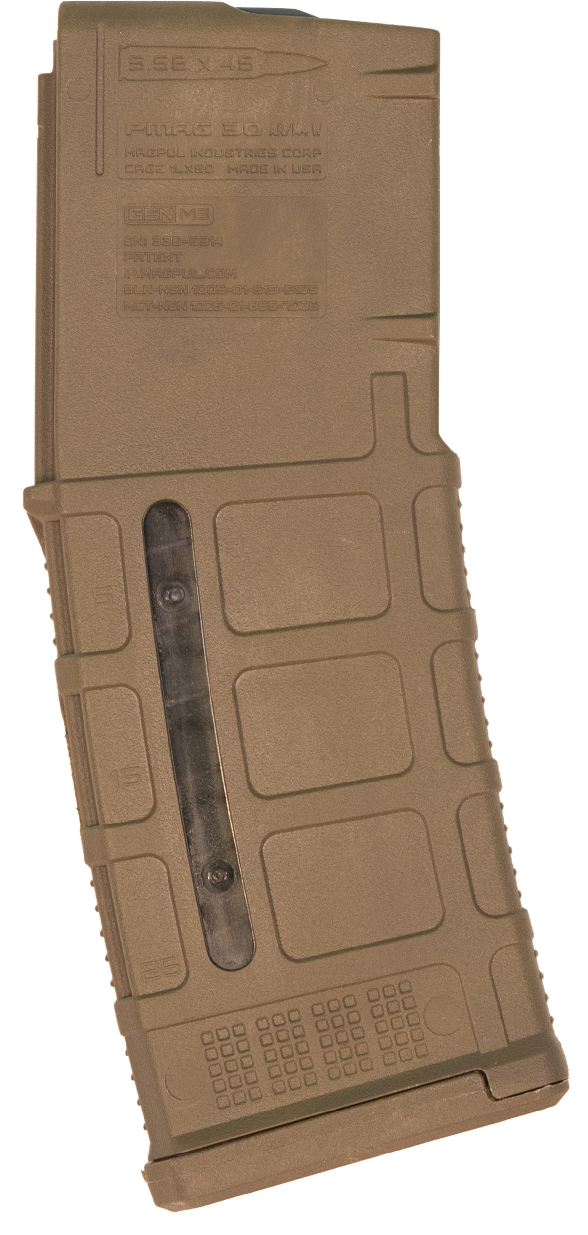 Made in the usa, the next-generation pmag 30 gen m3 window is a polymer magazine for ar15/m4 compatible weapons that features transparent windows to allow rapid visual identification of approximate number of rounds remaining.Similar to the moe pmag, the gen m3 window features a long-life usgl-spec stainless steel spring, four-way anti-tilt follower and constant-curve internal geometry for reliable feeding, and simple tool-less disassembly to ease cleaning.In addition, a redesigned bolt catch notch in the rear of the magazine provides increased bolt catch clearance, while an over-travel stop on the spine helps ensure the magazine will not over-insert on compatible weapons.Low profile ribs and new aggressive front and rear texture gives positive control of the gen m3 in all environments, and a paint pen dot matrix has been added to the bottom panel of the body to allow easy marking by the end user for identification.The new, easy to disassemble flared floorplate aids extraction and handling of the magazine while providing improved drop protection, but is slightly slimmer than before for better compatibility with tight double and triple magazine pouches.