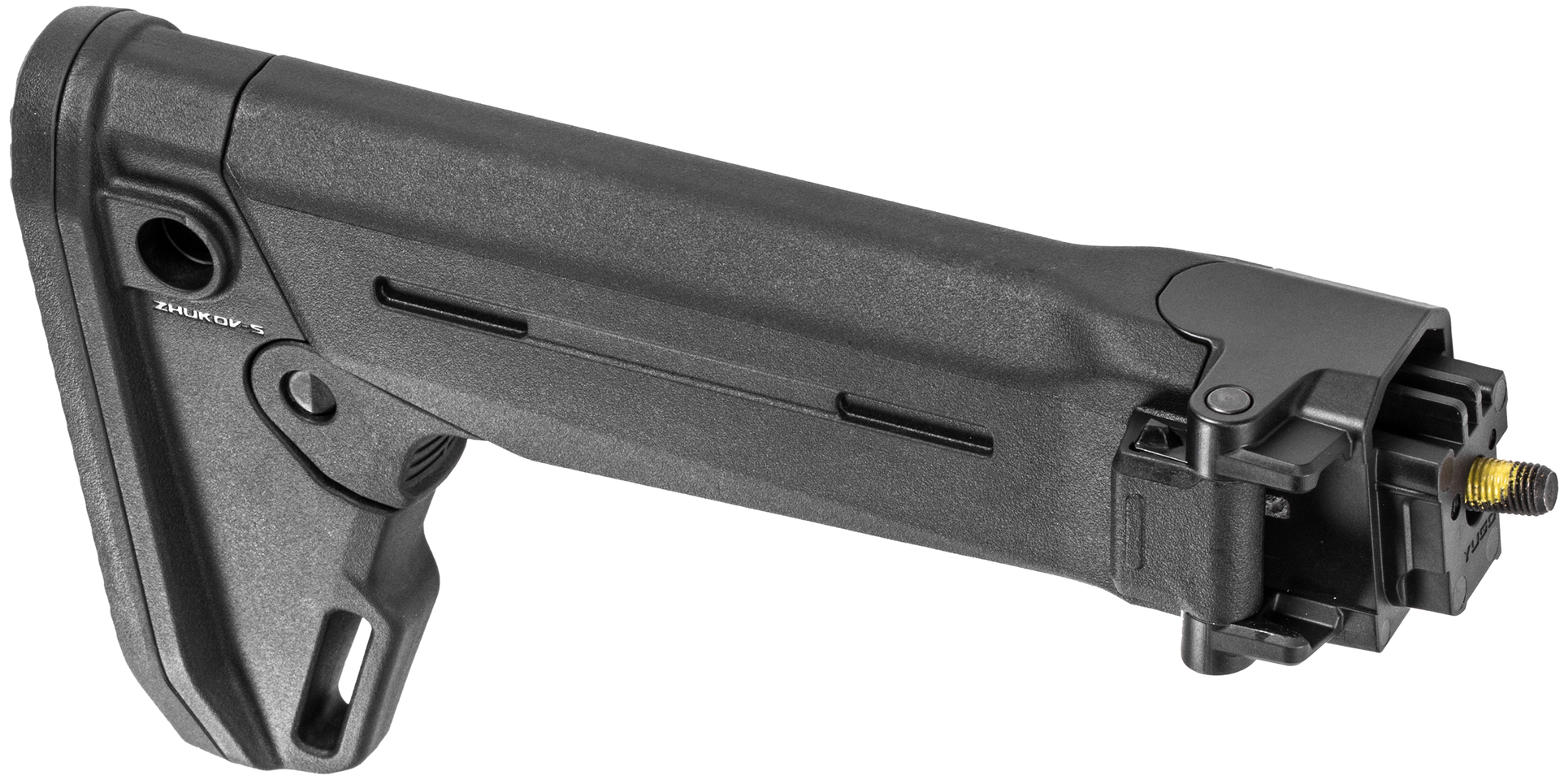 The yugo zhukov-s stock's hinge block for fixed-stock yugoslavian pattern rifles allows the user to replace their factory buttstock with this high quality folding polymer replacement.The hinge block mounts directly to the unique rear interface of yugo pattern rifles with the included hardware providing a very robust fit.A no-compromise folding stock for the modern ak, the zhukov-s stock folds to the right, has adjustable comb height for optics use via optional cheek risers, is adjustable for length-of-pull without tools, and features an angled rubber butt pad for easy shoulder transition and slip-free performance.An included one-point qd mount at the receiver, optional qd mounting points at the rear of the stock provides multiple sling attachment options.