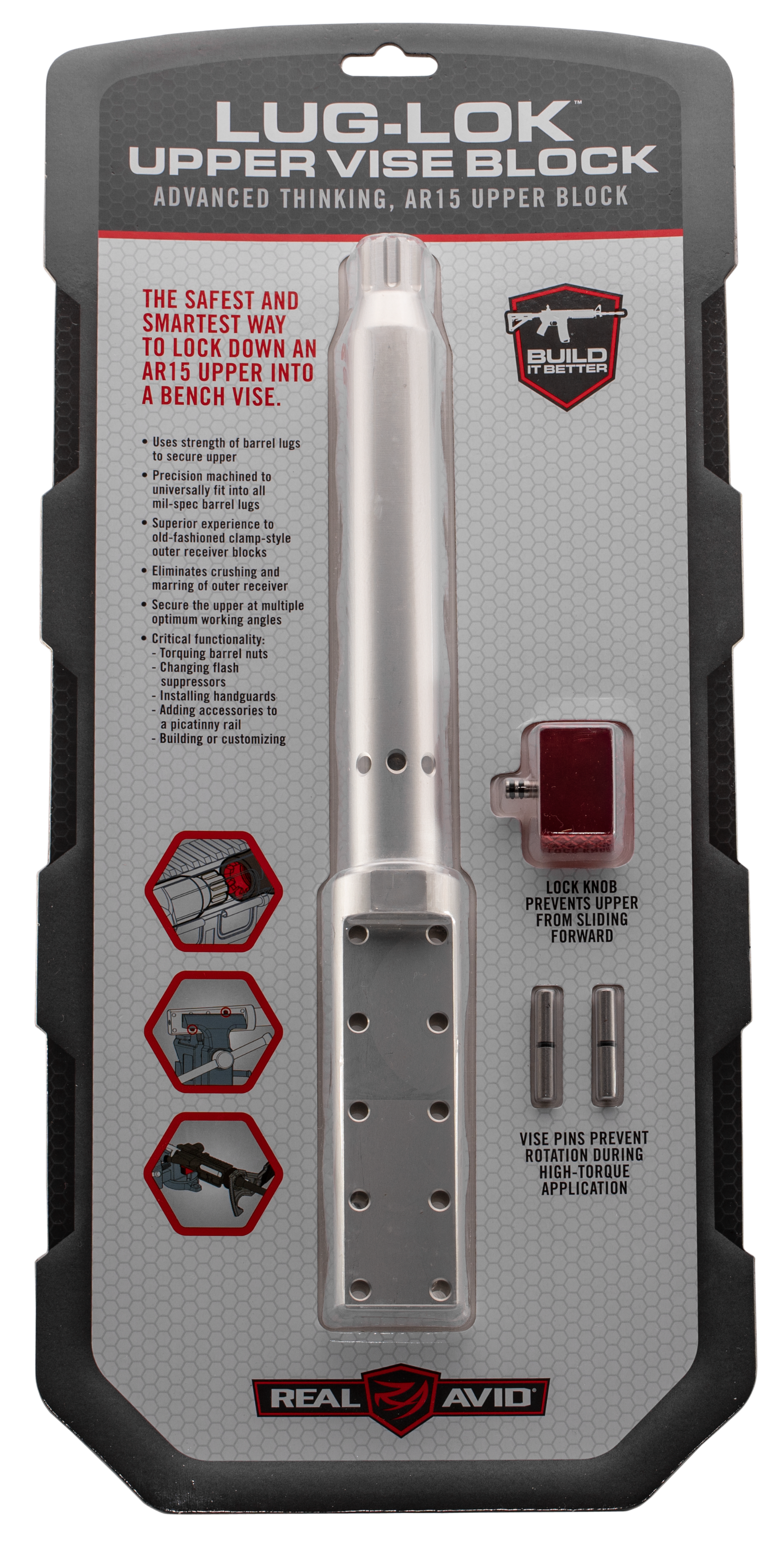 The lug-lok upper vise block uses the strength of barrel lugs to safely secure ar15 upper receivers while working, rendering clamp-style blocks obsolete.The non-marring, aircraft-grade aluminum block slides through the upper receiver and into the star chamber of barrels.This takes the pressure from torquing away from weak, damage prone parts and puts it squarely on the steel lugs.Adjustable vise pins hold the block at the optimal working angle and the lock knob ensures the upper receiver stays exactly where needed.