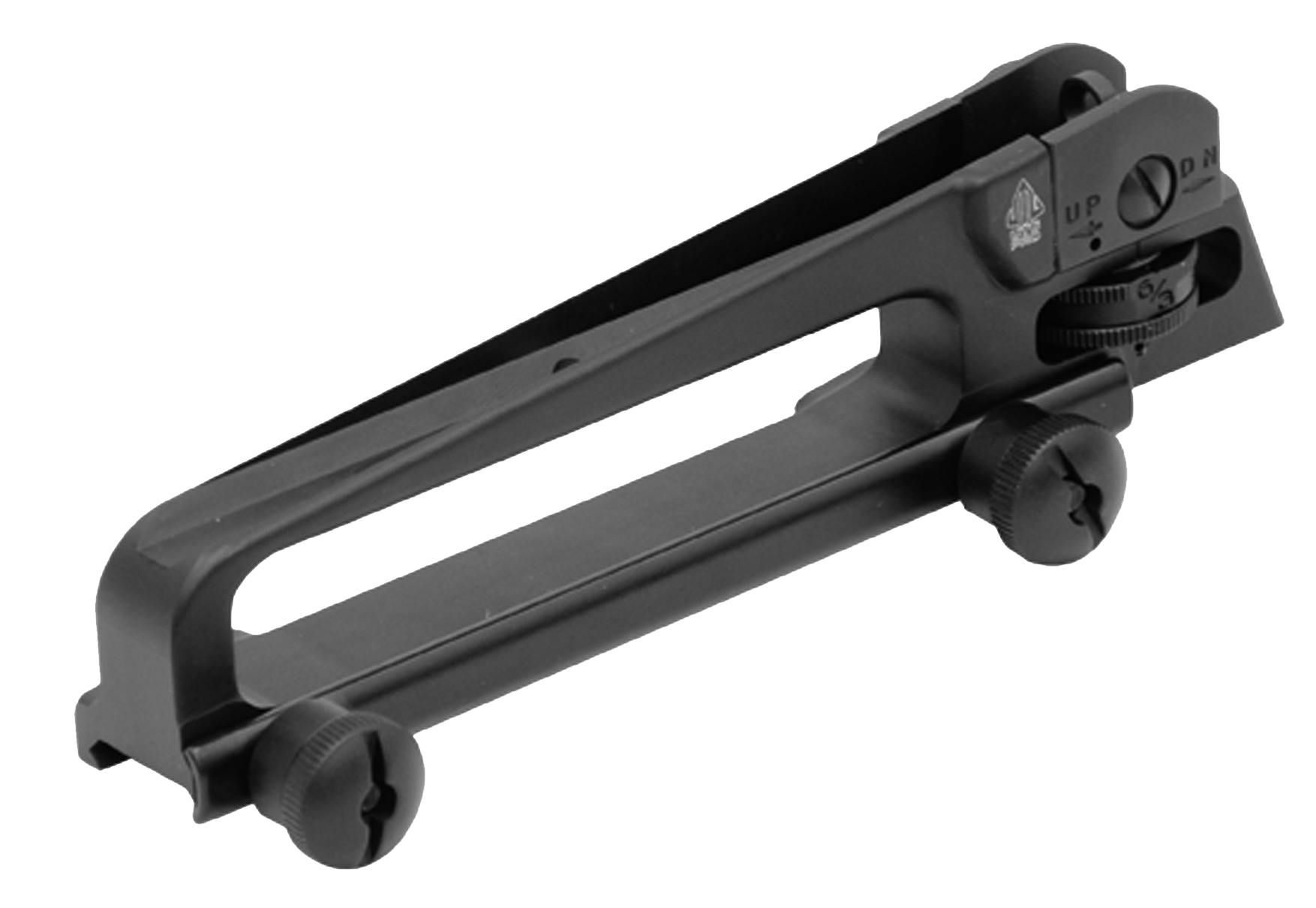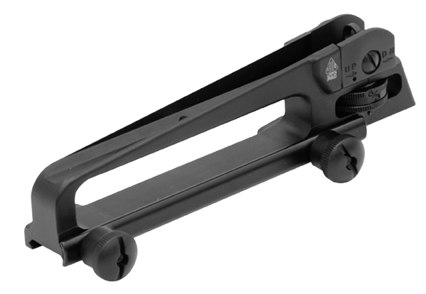 The utg pro mil-spec forged carry handle sight features 7075-t6 aluminum alloy with a anodized black matte finish.Rugged steel a2 sight assembly provides precision and reliable windage/elevation adjustment, complete with dual aiming apertures for most applications.Exact height to co-witness with standard front sight and most electronic dot sights.Equipped with retention thumb nut for easy and secure clamping.Made in the usa.Finish: Black Hardcoat AnodizedType: Carry HandleModel:...View more