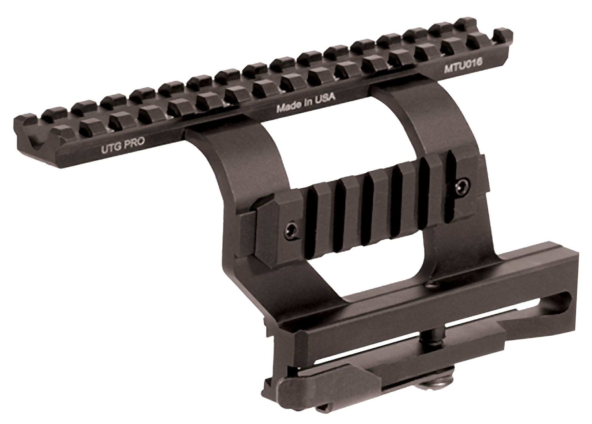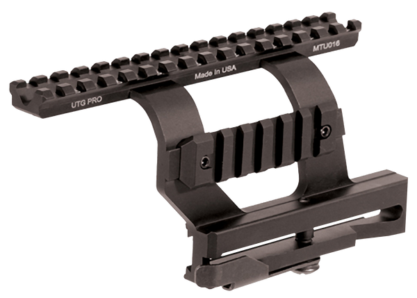 The utg pro quick-detachable ak side mount fits most ak and variants with side dovetail rail.Ergonomic lever with quick lock/release with full adjustability, u-cut on top for see-thru application with iron sights.Top rail with 16 slots for flexible optics applications and side rail with detachable 6-slot picatinny rail.Great zero holding and re-zoning capability.Made in the usa.