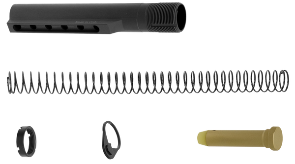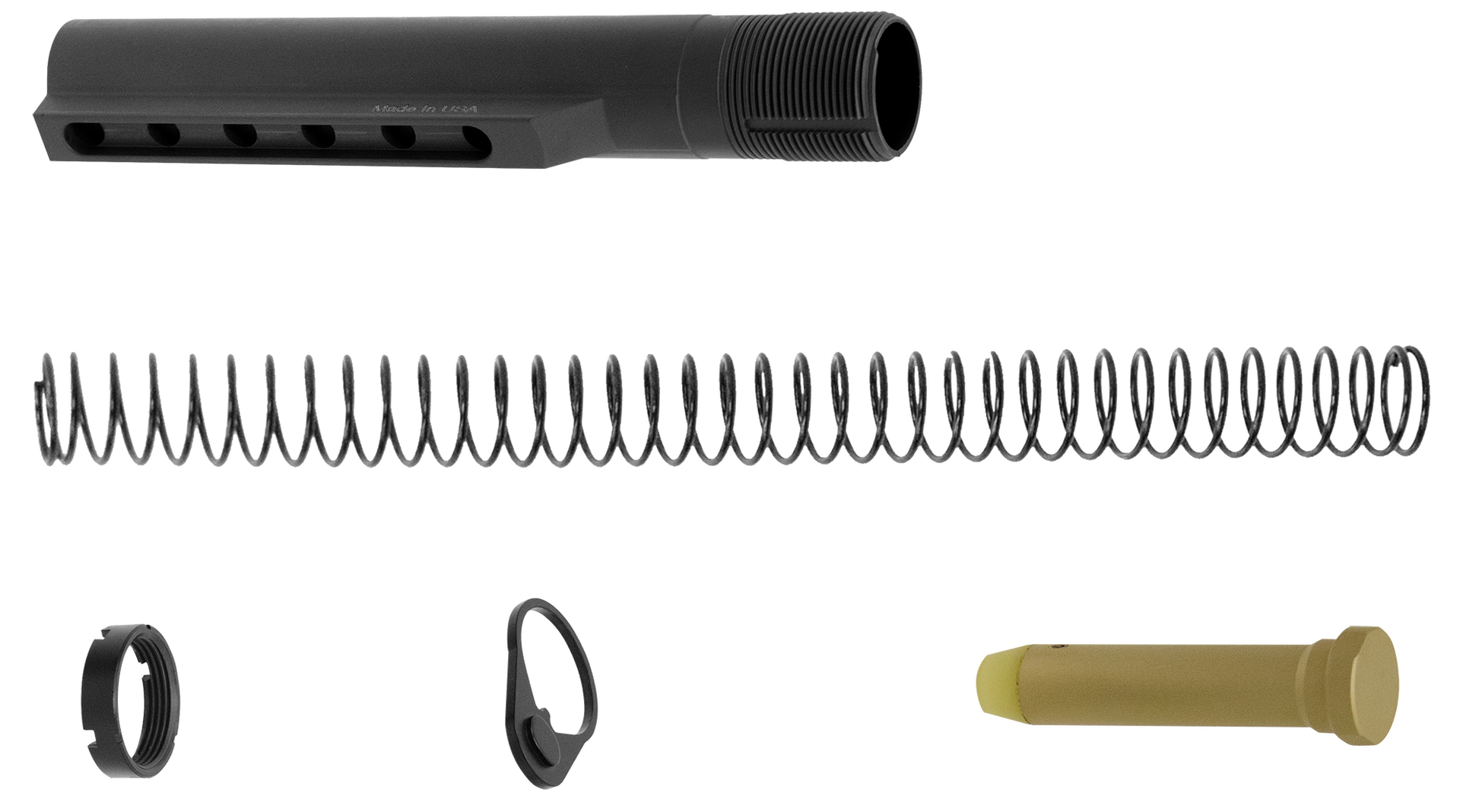 The utg mil-spec receiver extension tube kit is made from 6061-t6 aluminum with rolled threads and a matte black hard coat anodized finish.Included is a 6 position extension tube, carbine buffer, buffer spring, receiver end plate, and a castle nut.Made in the usa.Rails: Black Hardcoat AnodizedType: Buffer AssemblyFirearm Type: Receiver Extension KitMaterial: Mil-SpecFinish: AluminumView more
