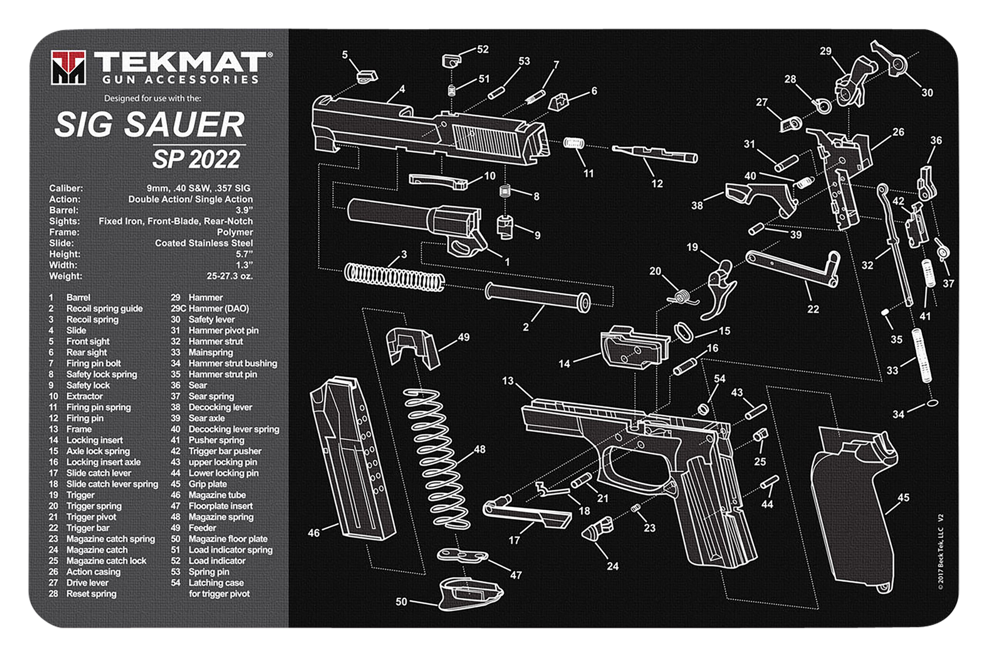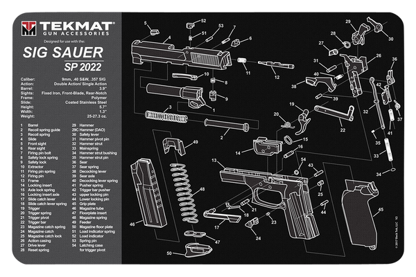 Sig sauer sp2022 tekmat has soft thermoplastic fiber surface ensures your gun doesn't get scratched.It keeps harmful chemicals, oil and dirt from penetrating down to your work area.Its oversized design gives you plenty of room to disassemble your handgun and to clean it without having to move parts all over.It has a thick 1/8 vulcanized rubber backing ensures the cleaning mat will protect your firearm and work surface.It also is water-resistant, scratch proof, fade, and oil resistant dye-sublimation printing for lifetime durability.Rolls up for easy storage along with your other cleaning supplies and accessories.