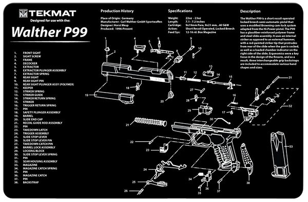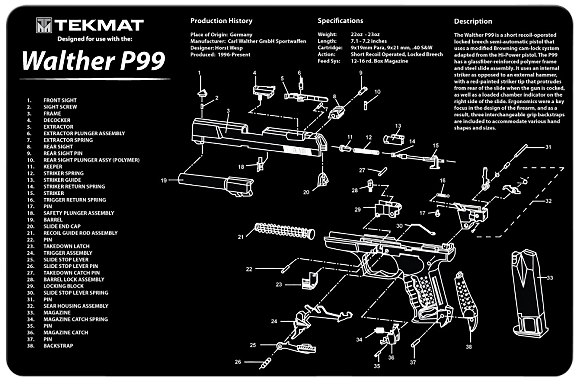 Walther p99 tekmat has soft thermoplastic fiber surface ensures your gun doesn't get scratched.It keeps harmful chemicals, oil and dirt from penetrating down to your work area.Its oversized design gives you plenty of room to disassemble your handgun and to clean it without having to move parts all over.It has a thick 1/8 vulcanized rubber backing ensures the cleaning mat will protect your firearm and work surface.It also is water-resistant, scratch proof, fade, and oil resistant dye-sublimation printing for lifetime durability.Rolls up for easy storage along with your other cleaning supplies and accessories.