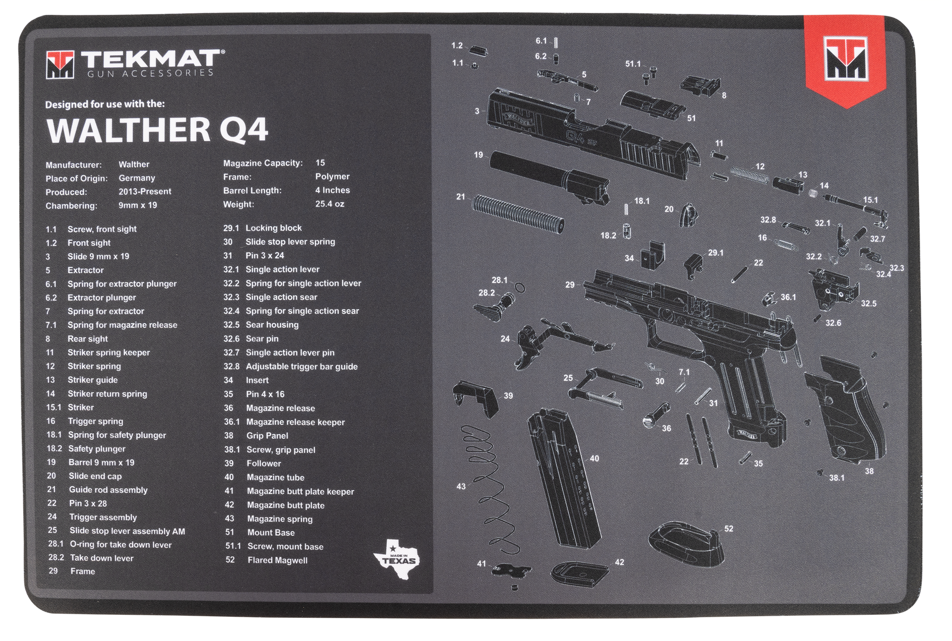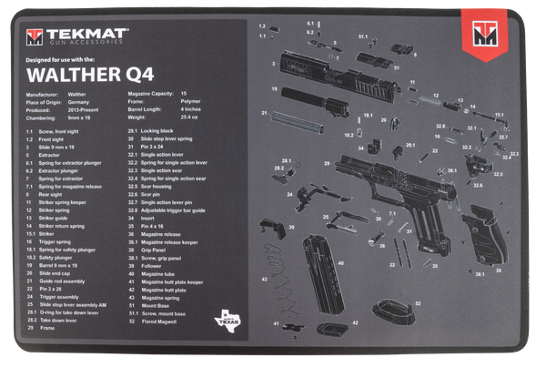 Walther q4 sf tekmat has soft thermoplastic fiber surface ensures your gun doesn't get scratched.It keeps harmful chemicals, oil and dirt from penetrating down to your work area.Its oversized design gives you plenty of room to disassemble your handgun and to clean it without having to move parts all over.It has a thick 1/8 vulcanized rubber backing ensures the cleaning mat will protect your firearm and work surface.It also is water-resistant, scratch proof, fade, and oil resistant dye-sublimation printing for lifetime durability.Rolls up for easy storage along with your other cleaning supplies and accessories.