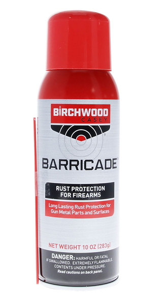 Barricade rust protection rapidly drives out moisture from metal pores and deposits a transparent protective coating which seals the surface.Its the best way to protect your firearms from rust.Withstands 500 hours in astm humidity test and 96 hours in astm salt spray test.Barricade rust protection is also an excellent penetrate for loosening rusty or frozen parts, as well as a good lubricant and an effective bore cleaner.