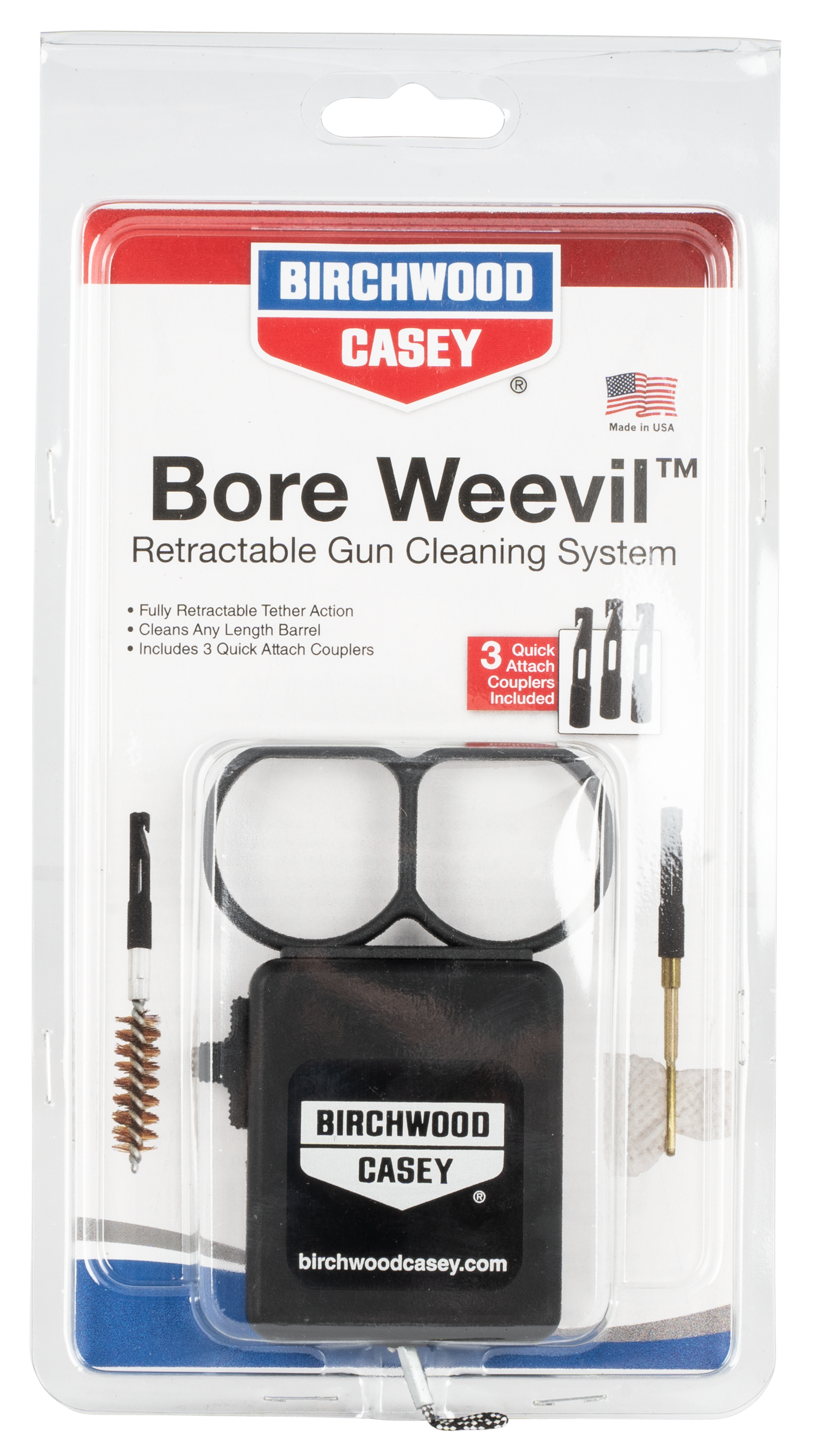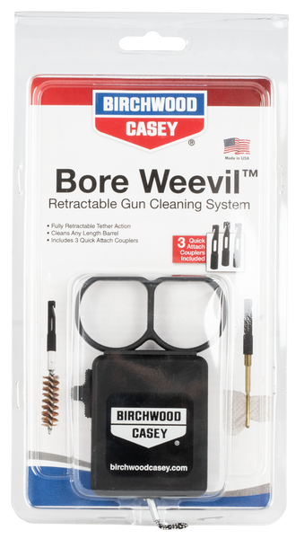 Birchwood casey's bore weevil retractable cleaning system features a fully retractable pull-through tether to reduce contact with cleaning chemicals and make portability an afterthought.Simply thread a brush, jag and/or a mop on each of the quick attach couplers.Bore weevil is compatible with almost every available cleaning brush, jag, mop and looped patch puller on the market.The bore weevil can be adjusted to any length for virtually any firearm.Includes three quick attach couplers that eliminate the need to thread attachments on and off to change the functionality of your cleaning rod.