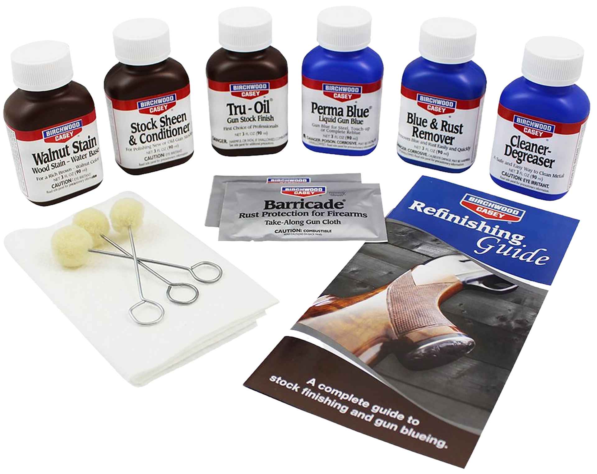 Birchwood deluxe blueing & stock finish kit is the easy to use kit for making that old favorite look new again.The perma blue liquid gun blue and tru-oil gun stock finish are leaders in blueing and stock finishing.Kit includes- 3 oz perma blue liquid gun blue, 3 oz tru-oil gun stock finish, 3 oz cleaner-degreaser, 3 oz walnut stain, 3 oz blue & rust remover, 3oz stock sheen & conditioner, blueing applicators, sponge, service cloth, barricade rust protection gun wipes and a complete instruction guide.