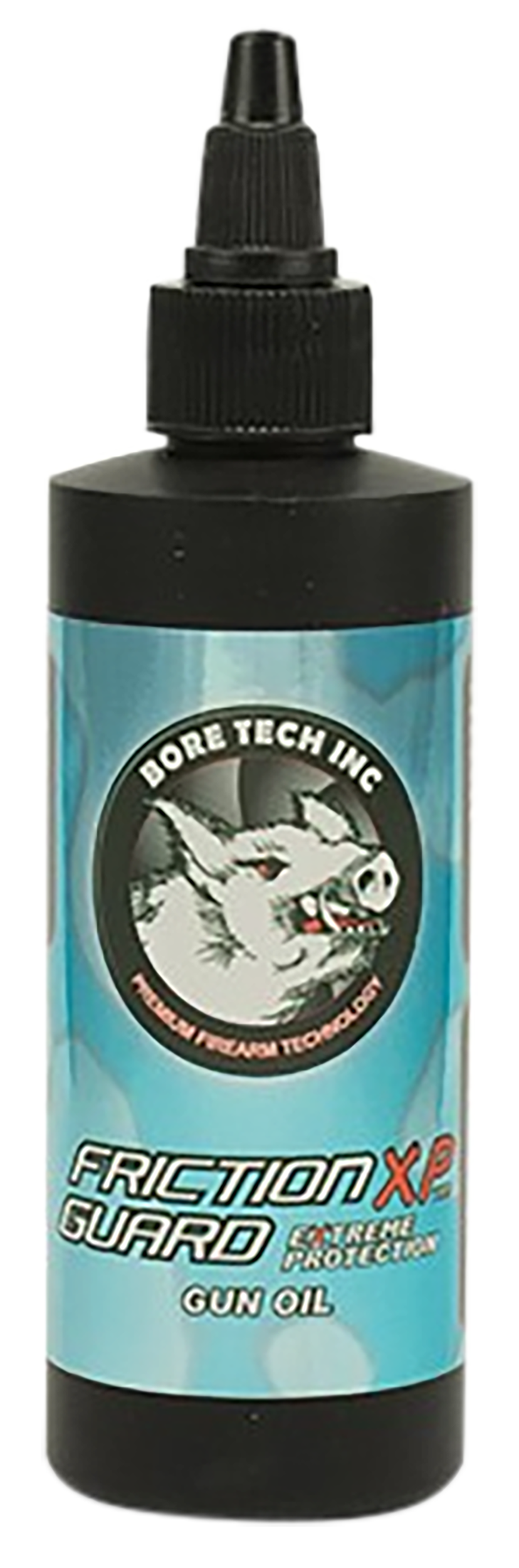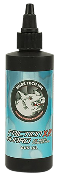 Bore tech's friction guard xp gun oil is a premium synthetic blend of high-purity petroleum based oils.It has enhanced rust and carbon preventives to help in performance lubrication and metal conditioning.This cleaner is ideal for barrels, trigger assemblies, actions, bolts, pistol slides, and other moving metal parts.
