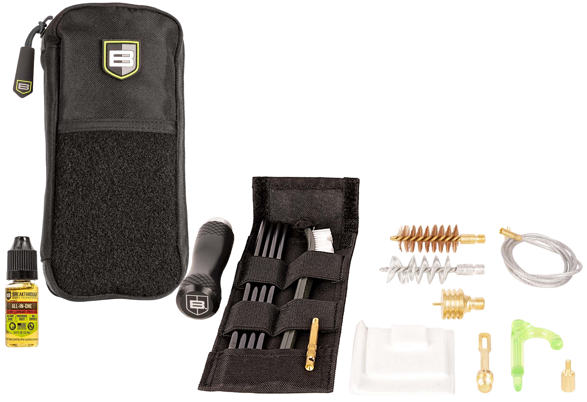 Experience the ultimate convenience with the breakthrough clean technologies badge series rod & pull-through cleaning kit.This all-in-one kit packs a punch, ensuring your gun stays in top-notch condition.Featuring top-of-the-line cleaning tools and highly effective all-in-one clp, this kit has everything you need to clean your 12-gauge firearms.Provided are all accessories needed and is neatly organized in a rugged nylon molle pouch.Elevate your range day with a cleaner, and a more reliable firearm with breakthrough clean technologies.