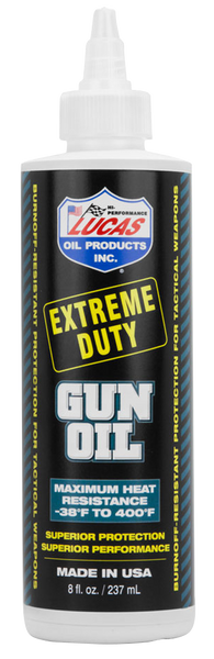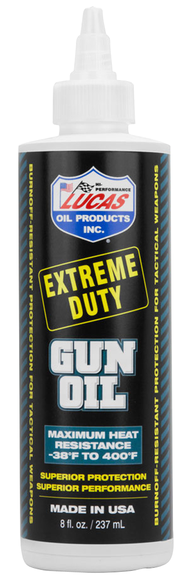 Lucas extreme duty gun oil is a special blend of oil and petroleum-extracted additives producing a lubrication specially formulated for high volume, high heat and friction firearms.The oil is designed for semi-auto rifles, shotguns and pistols as well as full auto firearms and suppressors.It offers superior burn-off resistance and the polymeric film protects metal from rust, moisture and dramatically reduces wear during all shooting conditions.
