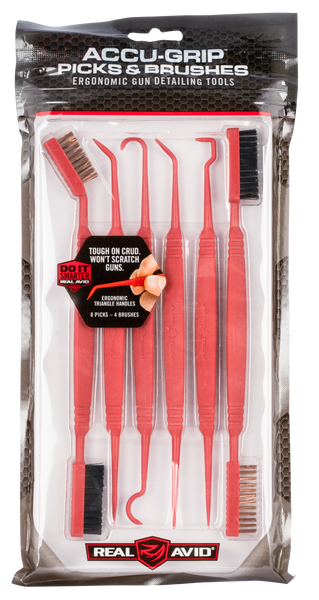 The unique real avid-style gun cleaning picks and brushes get the job done, feel good in your hand, and wont scratch your firearm.The triangular handles naturally and comfortably fit in your fingers providing precise control for detailed cleaning even in the hardest to reach spots.Eight profiles dig gunk out of the places that even the sun don't shine.Included are four brushes with nylon, bronze phosphor, and a combination smart brush, specially angled to reach surfaces in firearms that were nearly impossible to reach before.They're tough on the crud but tender on the metal.