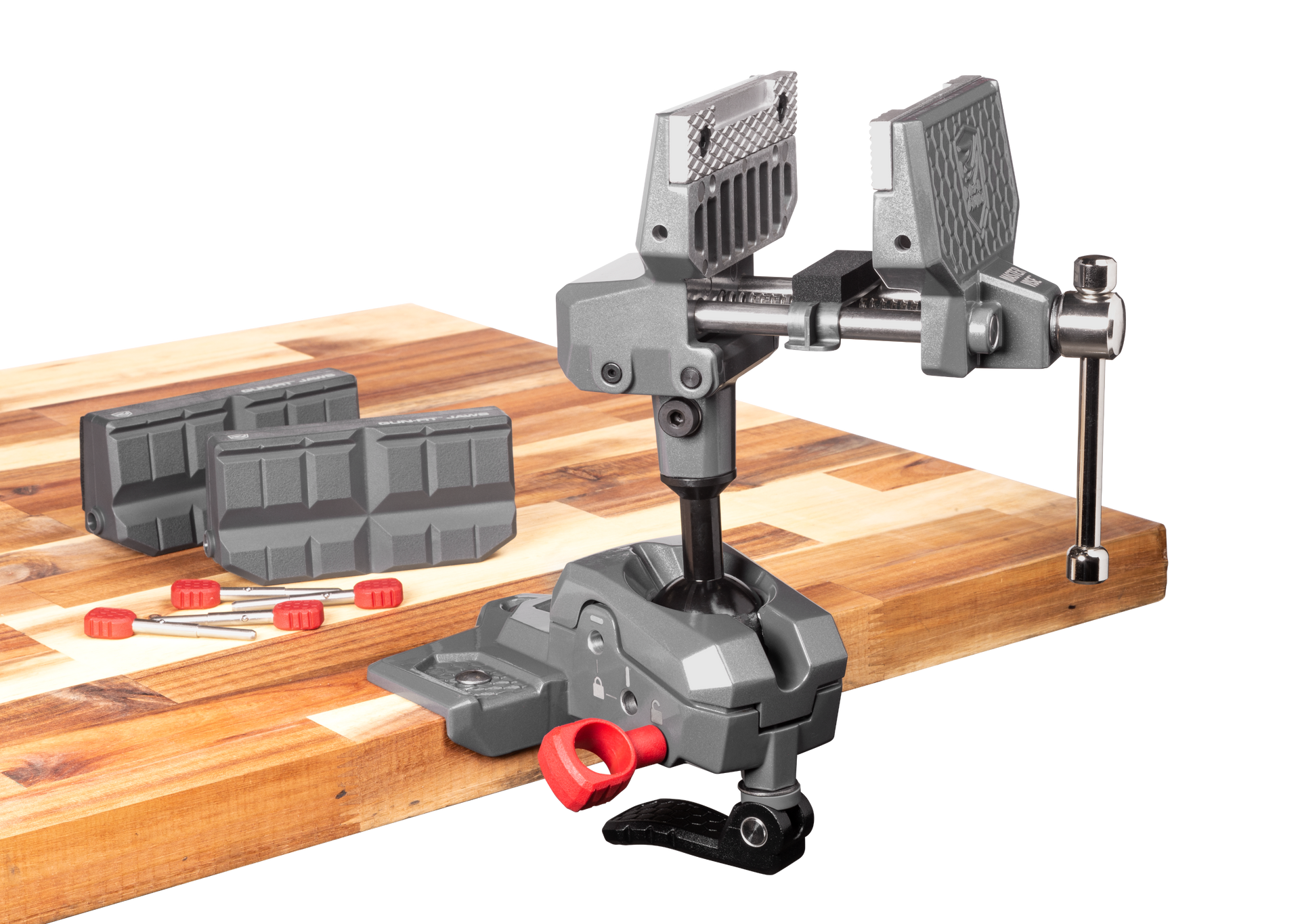 Multi-axis bench-mount vise with torq-lok: the first real bench vise made exclusively for guns and gun tools.Whether you're building and customizing, repairing and cleaning or mounting scopes and accessories, this vise improves every part of the gun diy experience.Quickly reposition your gun to any orientation without ever removing it from the vise.Insert the torq-lok pin for applying heavy force.Use the removable and reversible gun-fit jaw...View more
