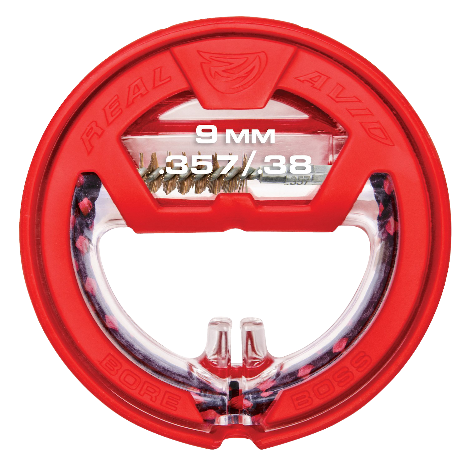 Real avid bore boss is a self-storing, easy-feeding, clean-pulling, field-ready, hassle-free, pure-genius bore cleaner.The bore cleaner is a single pass cleaning solution for.357/.38/9mm handguns.It has a 12" dual-action cable that first loosens carbon and fouling with the phosphor bronze bore brush then removes it from the bore with the 8 1/2" braided bore mop.The flex-case handle has ergonomic grip to help you comfortably pull the tight fitting, dual-action cable through the bore.The unique flex-case handle also stores and protects the brush and mop from damage and debris and keeps oil and solvent from getting on your other gear.