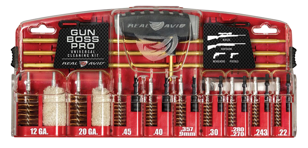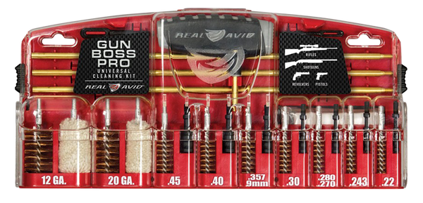 The gun boss pro universal cleaning kit is a sturdy, sleek, secure tool case loaded with high-quality brass rods and a innovative multi-function rod handle.The components and compartments are labeled making organization a breeze and the patent pending kickstand case keeps everything within easy reach.Included in the kit is a multi-function handle that rotates, taps pins, and works as a detailing handle, a three brass rod sections, 12 ga., 20 ga.Brush and mop,.45 cal.,.40 cal,.357 cal./.38 cal./ 9mm,.30 cal,.280 cal./.270 cal./ 7mm,.243 cal,.22 cal.Brush and jag, large and small slotted tip, 25 1.2" x 2.4", and 25 2" x 2.4" cleaning patches, and screw holes for permanent mounting.
