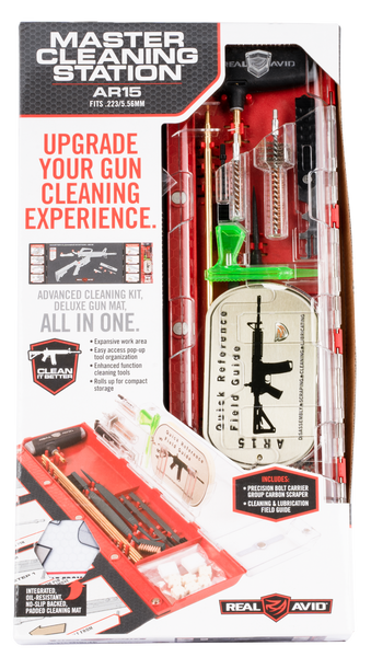 Upgrade your cleaning experience with the worlds first ar-15 master cleaning station.It combines a next-gen cleaning mat with an intelligently designed cleaning kit filled with an extensive set of ar-15 cleaning tools.The kit provides how-to cleaning and maintenance instruction and keeps easy-to-lose gun parts organized while you work.It also provides a huge work area for a completely disassembled gun, yet rolls up for compact storage in the included bag.The kit includes: multi-function t-handle; star chamber brush;.223 / 5.56mm bore brush; 3-in-1 bore illuminator, doubles as pin punch & safety flag; slotted bore patch tip; smart brushes; ultra-short nylon bristles provide superior carbon removal; specially designed head shapes; carbon scraping tips; accu-grip detailing picks & brushes; nylon brush; ergonomic handle; angled phosphor bronze brush; straight pick; angled pick; 3 premium brass rods; 50 cleaning patches; star chamber cleaning pad tip; 6 felt star chamber cleaning pads.