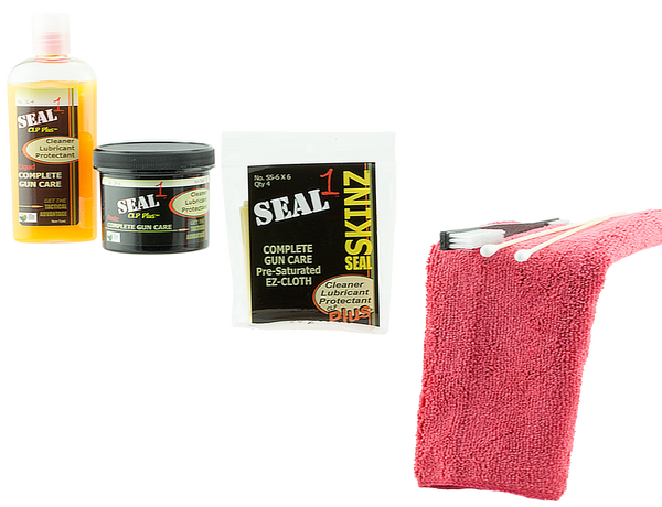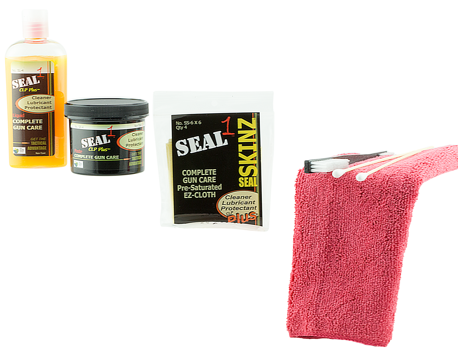 Seal 1 complete tactical gun care kit includes a 4oz.Container of clp plus paste and liquid, 1 package of clp plus pre-saturated ez-cloth, a 4 - 6 inch square cleaning cloth pre-saturated with clp plus paste, 12"x12" square micro fiber cloth, a double ended nylon utility brush, 6" hardwood cotton swabs, and two 5ml tubes of clp plus paste.