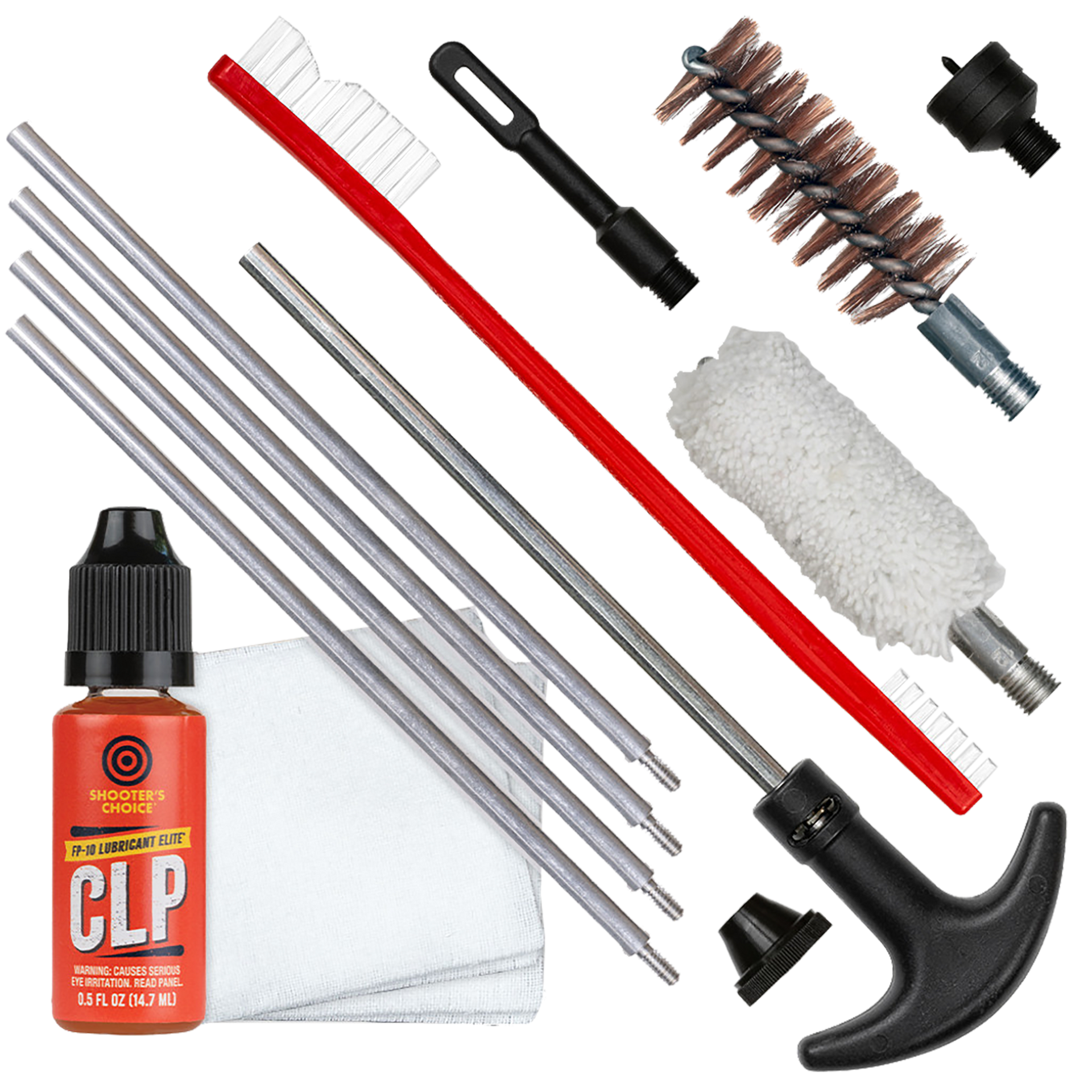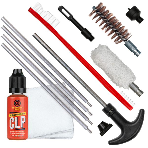 Shooters choice 12 ga shotgun cleaning kit contains quality components that wont damage your firearm while cleaning.Get everything you need to clean your 12 ga shotgun in one place with this gun cleaning kit.Includes aluminum rod set with swivel t-handle along with a brush, mop, jag, slotted tip, adapter, bore guide and patches.An all purpose brush and bottle of fp-10 lubricant elite clp is also included to keep your firearm properly lubricated and operating smoothly.