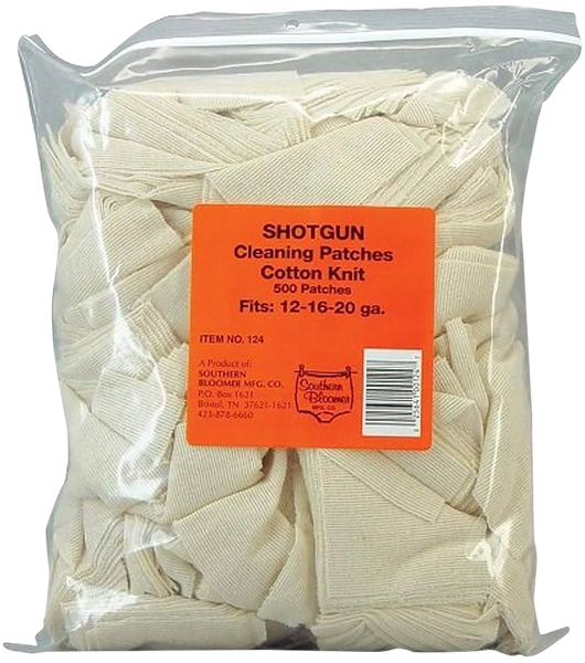 Southern bloomer cotton knit gun cleaning patches are thread less and are virtually lint free.When it comes to quality, price, and availability they simply cannot be beat.Type: Cleaning PatchesSize: All GaQuantity: 500 Per PkgMaterial: CottonSuitable For: FirearmsView more