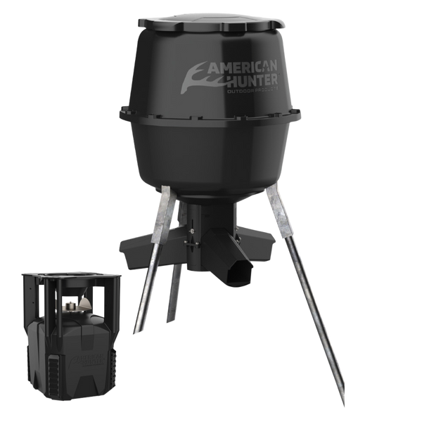 The xde-pro with hopper feeder features an ez-touch digital timer with large lcd display.The feeder has a simple spin plate, two q-set preconfigured settings and feeds 1-16 times per day at a feed rate of 1-60 seconds.It is pre-wired for american hunter's solar panel.Recommended de-30045 battery.