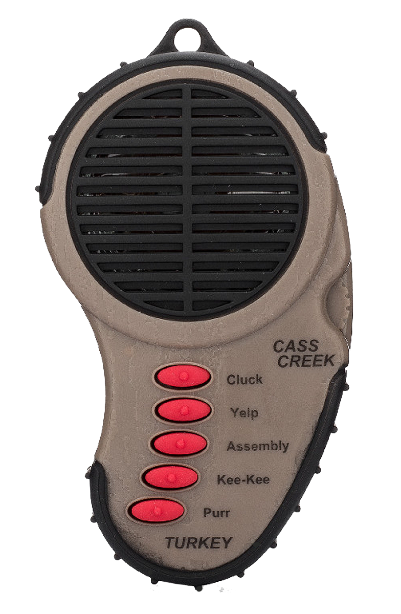 The cass creek ergo electronic turkey call is compact with an ergonomic grip.The cass creek ergo electronic turkey call features real live turkey calls- cluck, yelp, assembly call, kee-kee and purr.Calls by young turkey, turkey hen and adult male.Operates on three aaa batteries and comes with a belt clip.