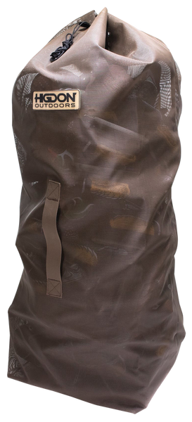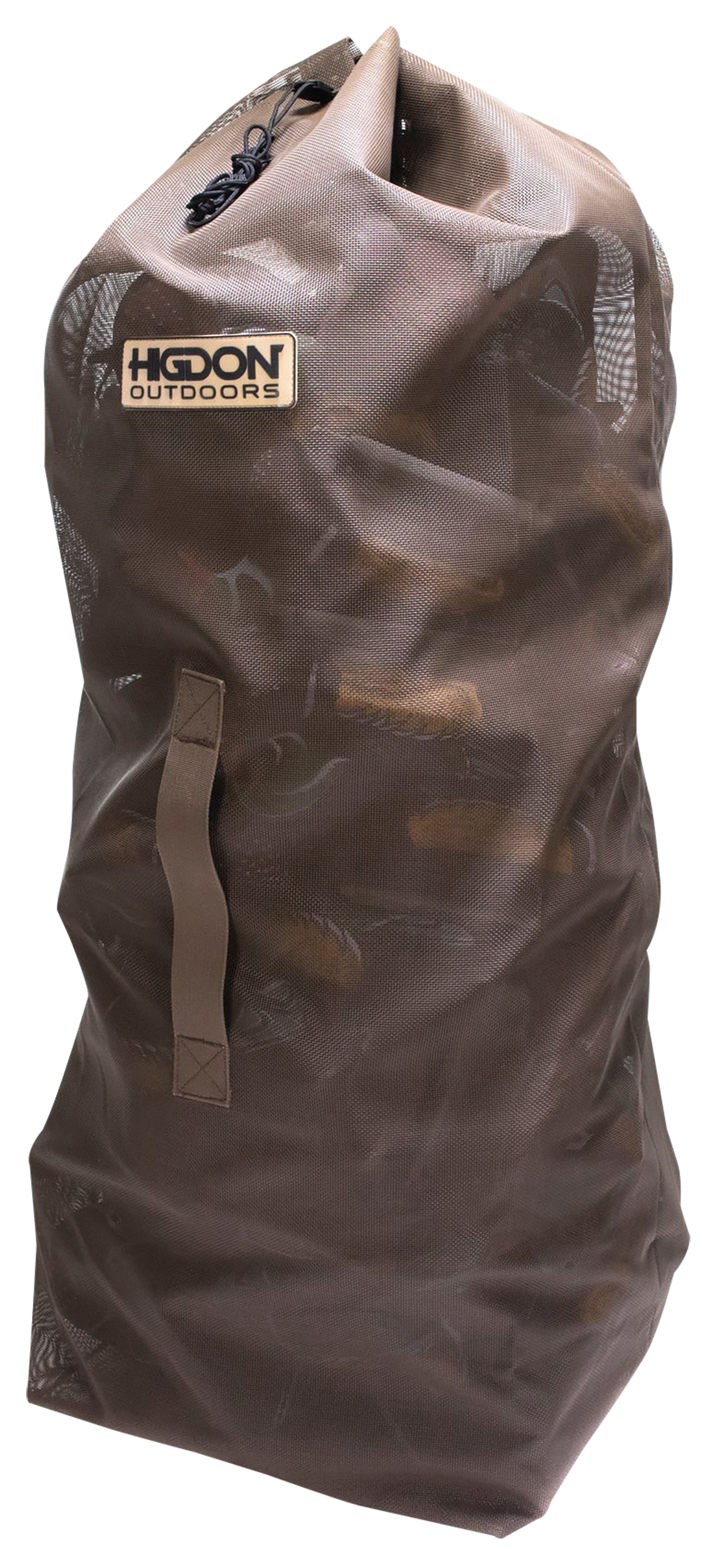 Higdon's black pvc coated mesh decoy bag is durable, lightweight and drains water easily.The backpack style straps keep your hands free while carrying or two regular carry straps for versatile carry.Easy to use, non-slip drawstring closure, holds up to 56 standard size decoys.Deployed size 51"x18"x15".Color: Black PVC CoatedMaterial: MeshSize: LargeView more