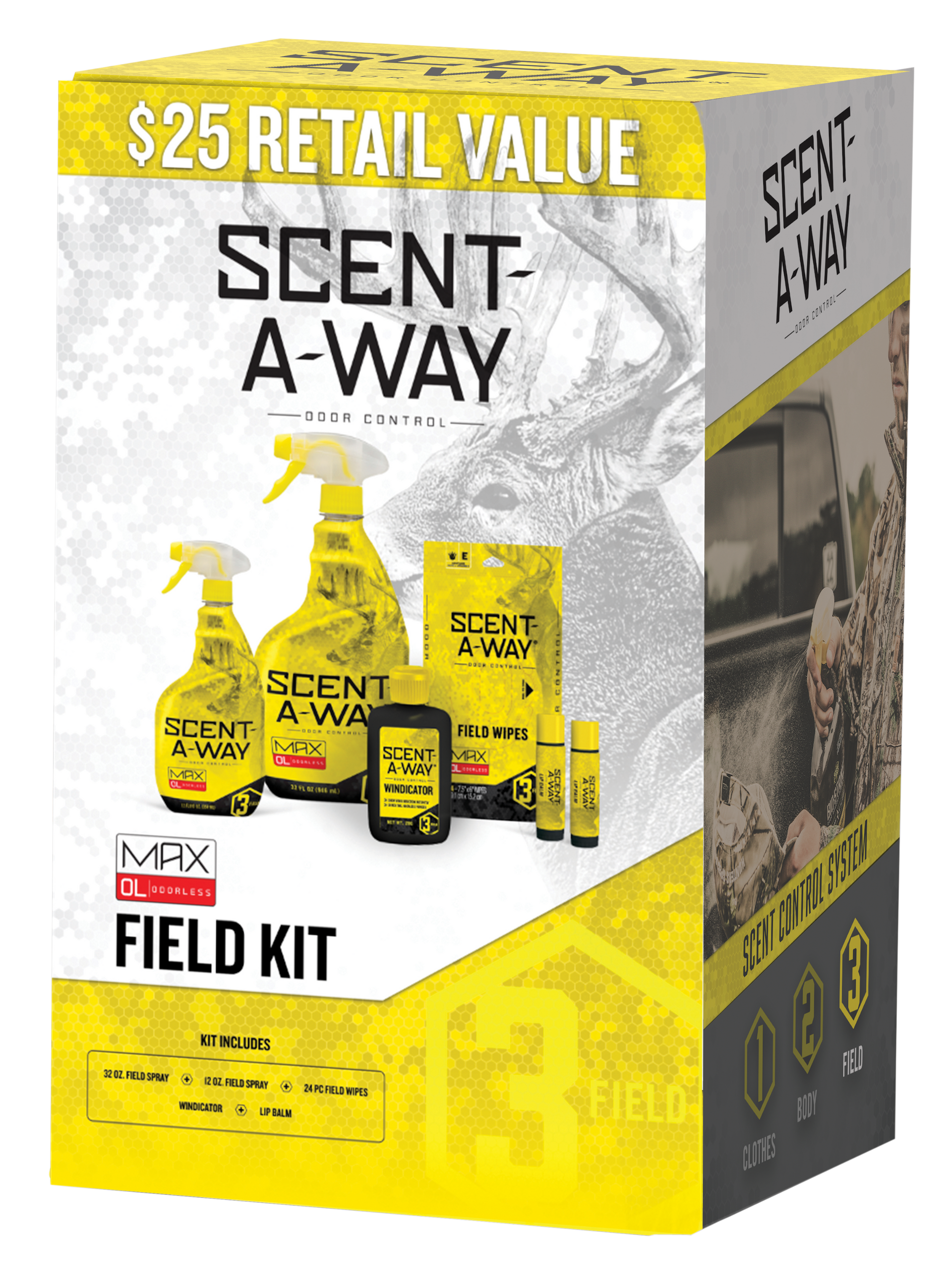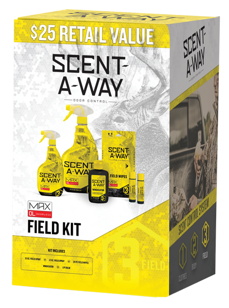The scent-a-way max field kit includes the key items needed for scent control system, conveniently all in one box.The scent-a-way max field kit includes: odorless 32oz field spray; odorless 12oz field spray; 24 odorless field wipes and odorless lip balm 2-pk and windicator.Quantity: 1Scent Type: Odor EliminatorScented: OdorlessView more