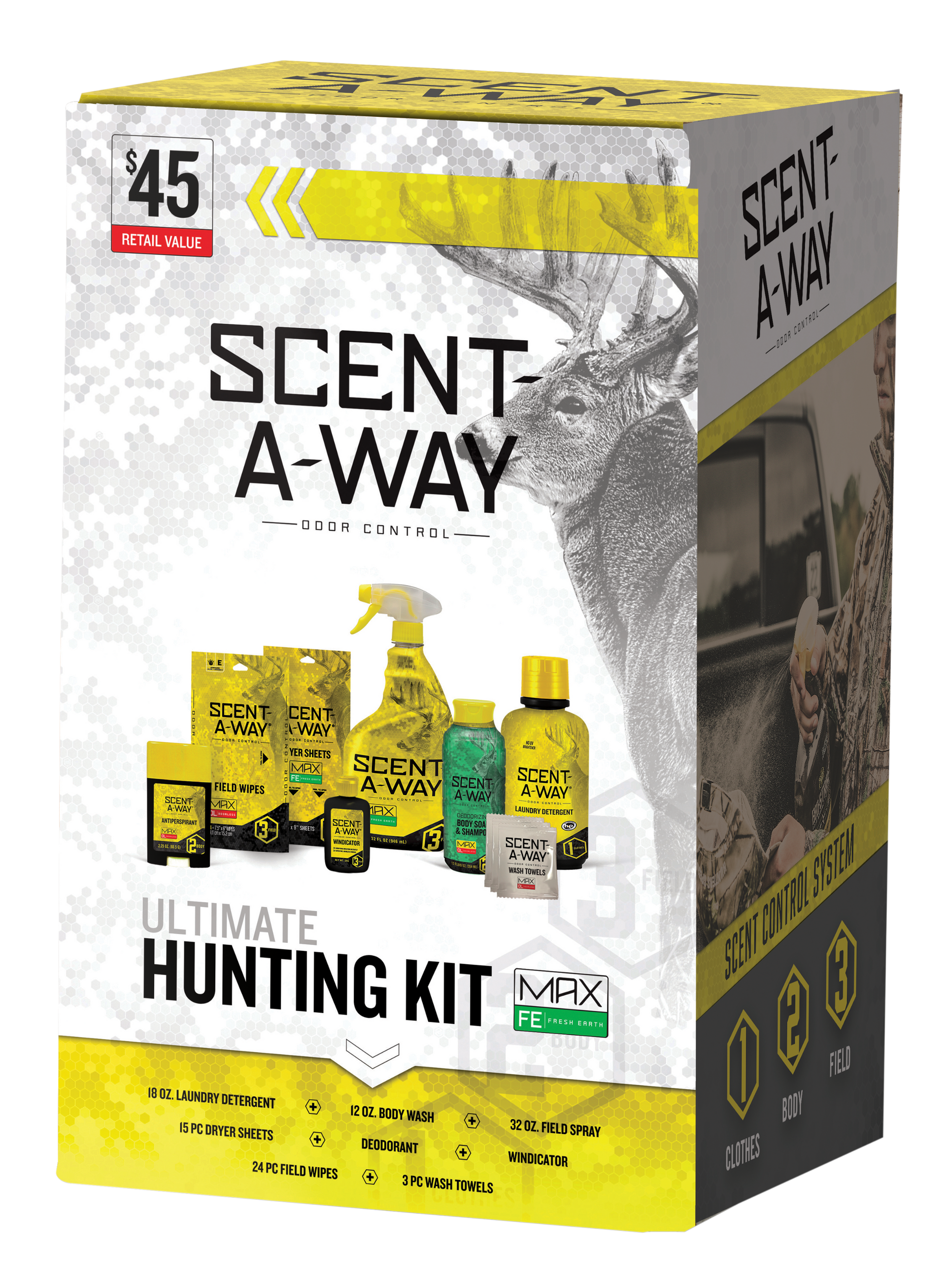 The scent-a-way max odorless ultimate hunting kit includes all the key items of each step all in one convenient box to make sure hunters are ready for the hunt.The scent-a-way max odorless ultimate hunting kit includes: 18oz laundry detergent odorless; dryer sheets 15-pk odorless; 12oz body wash/shampoo; antiperspirant; 32oz field spray odorless; field wipes 24-pk; wash towels 3-pk and windicator.Quantity: 1Scent Type: Odor EliminatorScented: OdorlessView more