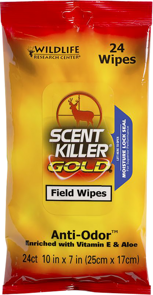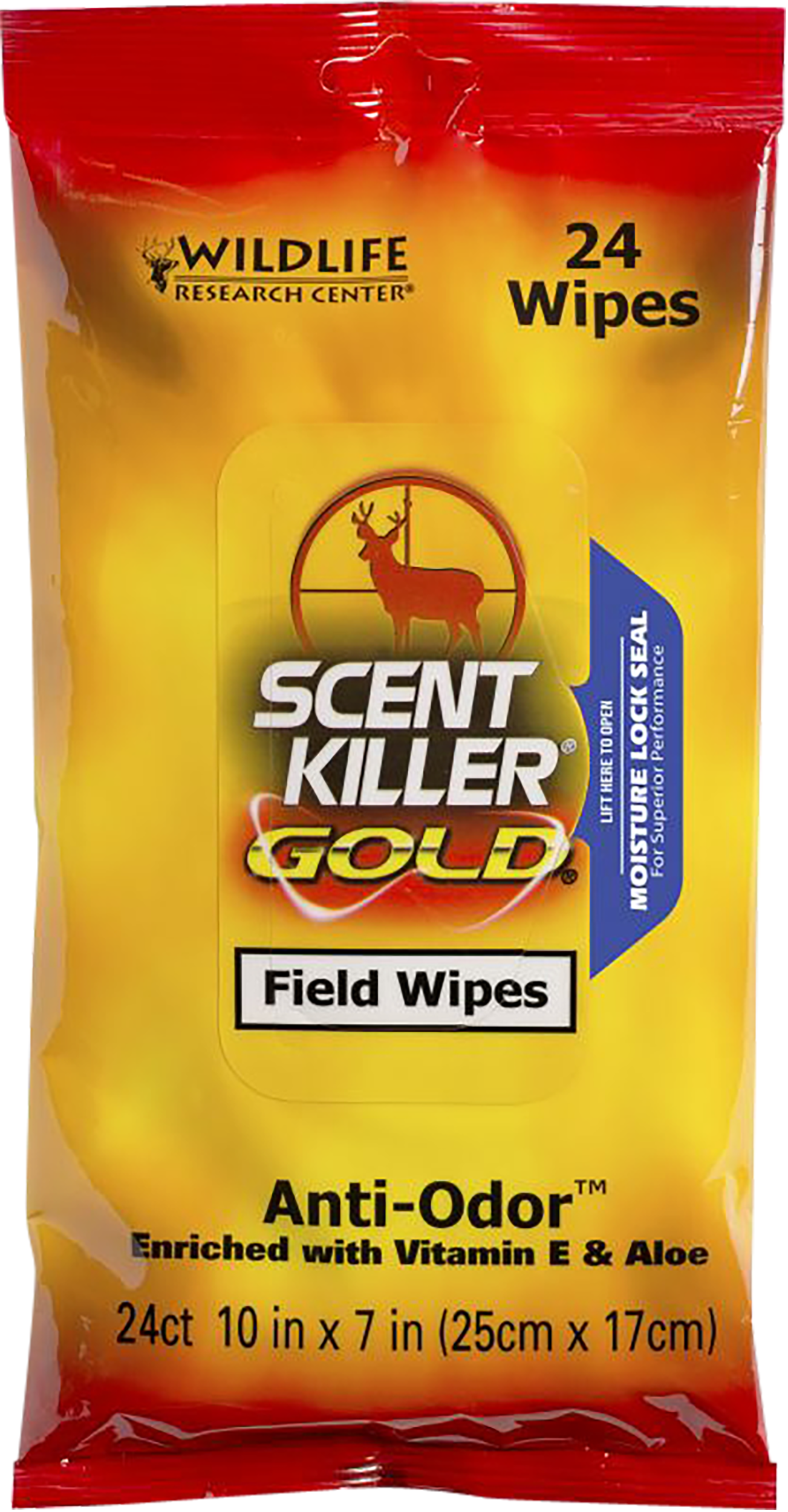 Wildlife research's scent killer gold field wipes are a convenient way to clean and deodorize in the field, when a shower is not available.These wipes are enriched with vitamin e and aloe and are made with a special anti-odor formula for your body.Quantity: 24Scent Type: Odor EliminatorDispenser Type: WipesScented: OdorlessView more