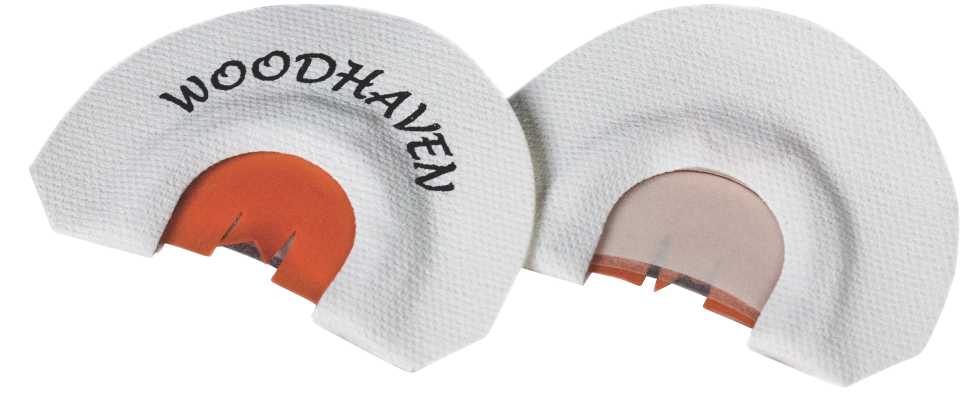 Woodhaven's copperhead diaphragm call is a 3 reed call that features one reed of orange, silky textured latex with a snake tongue cut, over two clear reeds.The copperhead is best for hard cutting and cackles and raspy yelps.
