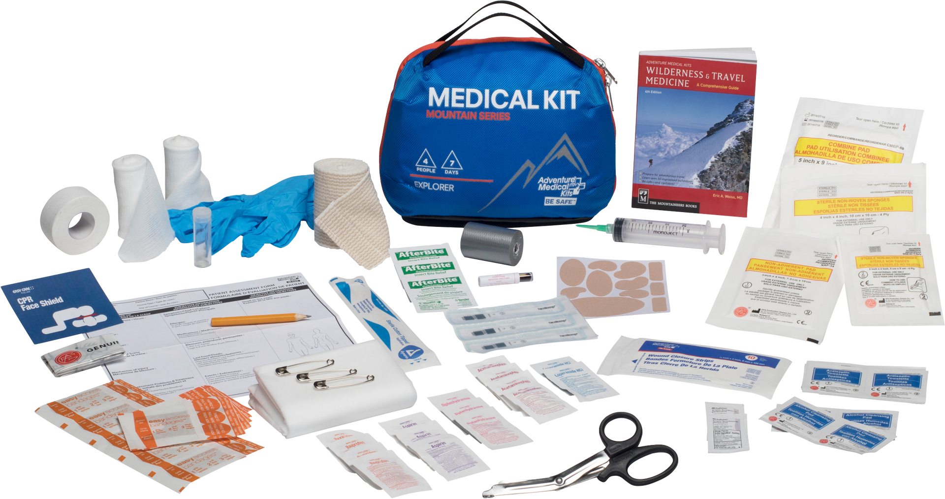 Comprehensive yet compact, the explorer is the ideal backpacking first aid kit for families or small groups headed out on a week-long adventure.This medical kit contains an abundance of first aid supplies to treat injuries and illnesses on extended camping or hiking trips.Hospital-quality supplies like wound closure strips and a cpr face shield let you treat blisters, close wounds, and administer cpr.A variety of medications let you manage everything from pain to allergies, while the single-use thermometer lets you monitor fevers.First aid hiking essentials are organized by injury into clearly-labeled pockets using the easy care organization system, making it easy for anyone in your group to provide fast and effective first aid.The water-resistant medical bag features semi-transparent pockets to keep the contents safe and easy to access for your whole trip.Add the mountain explorer kit to your backpacking gear to keep you and your group safe wherever your journey takes you.