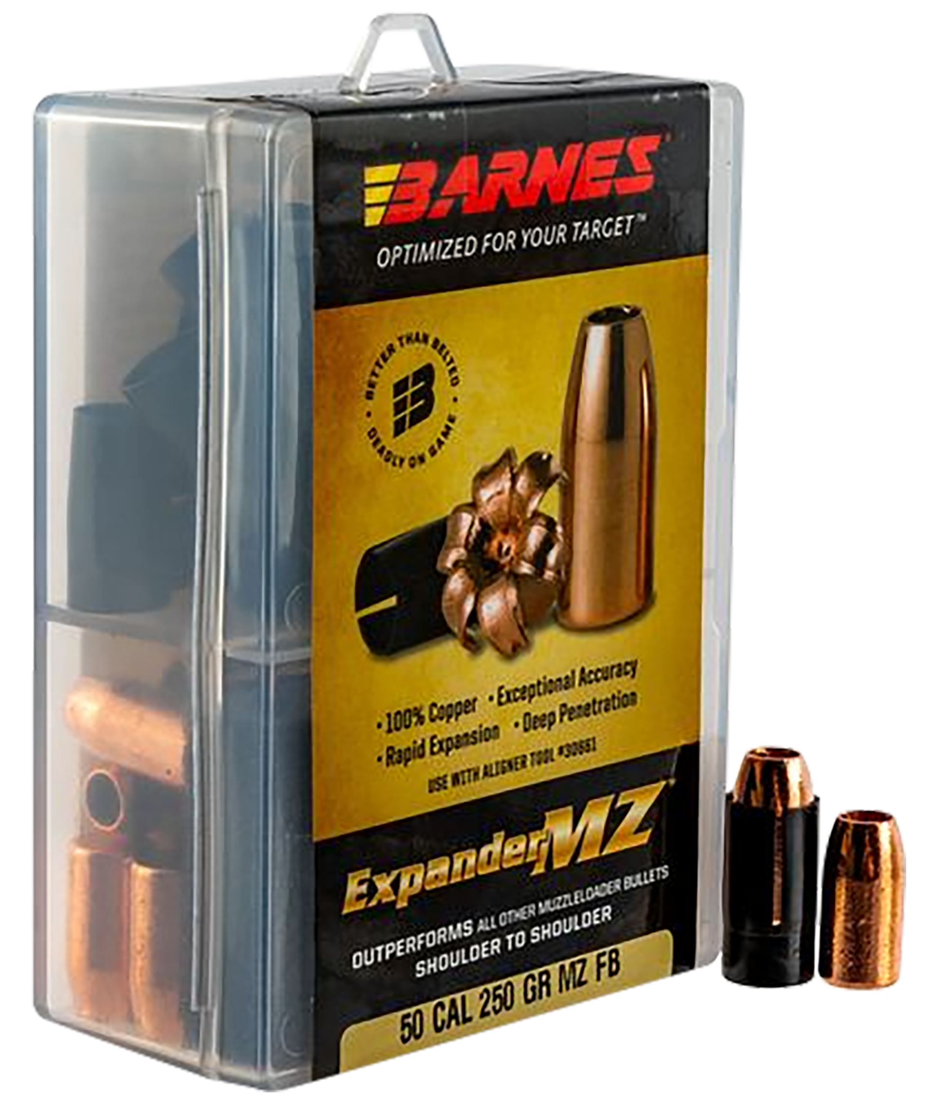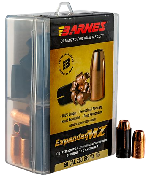 This muzzleloader version of the x-bullet is 100% copper with a large, hollow cavity for quick, sure expansion.Barnes expander mz muzzleloader bullets produce more consistent shot-to-shot velocities and better accuracy for greater shooter confidence and more one-shot kills.Expander mz bullets deliver deadly performance at both high and low velocities.These tough, deep-driving bullets typically retain 100% of their original weight.They expand to twice their original diameter, creating six razor-sharp copper petals that slice through game.