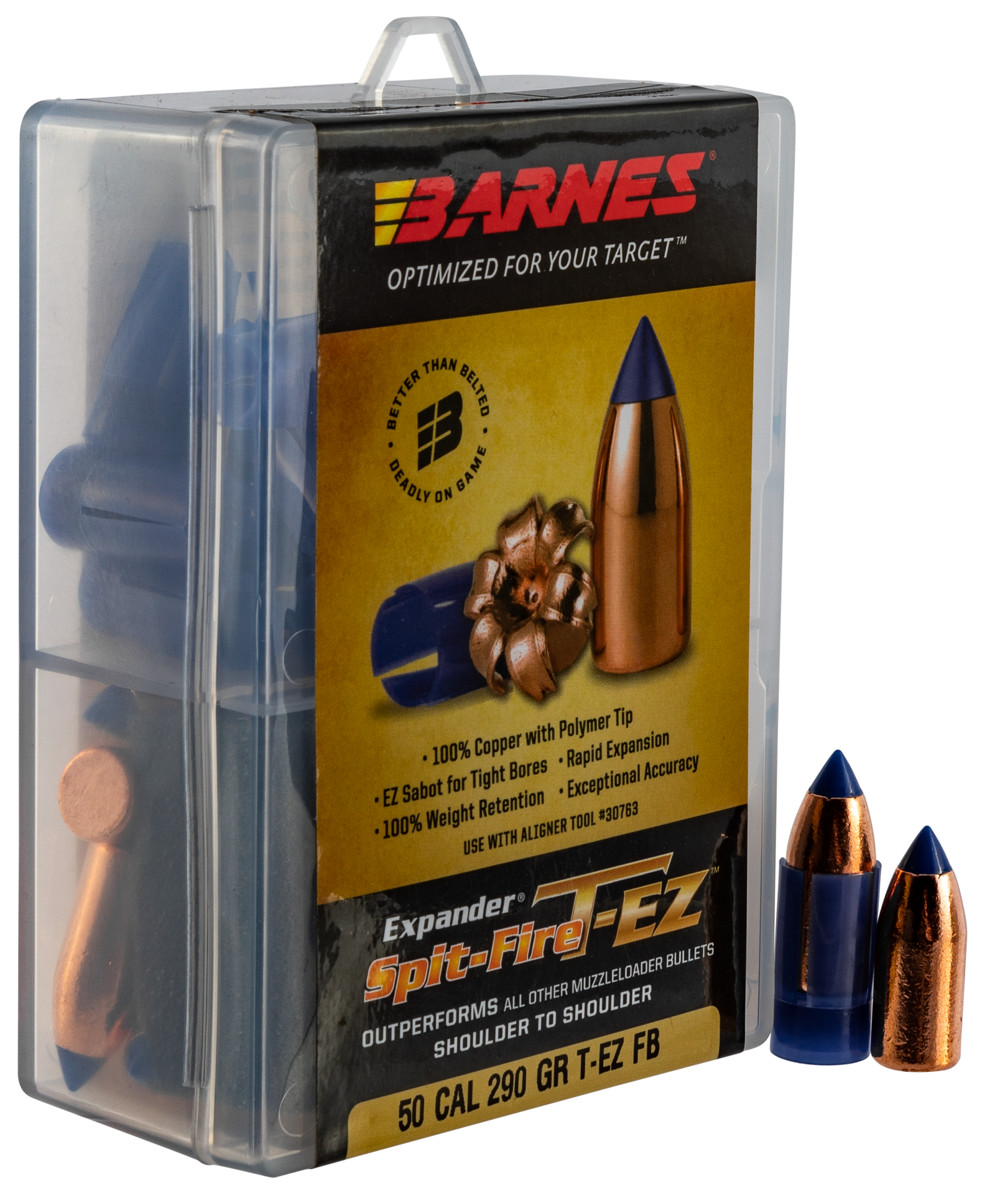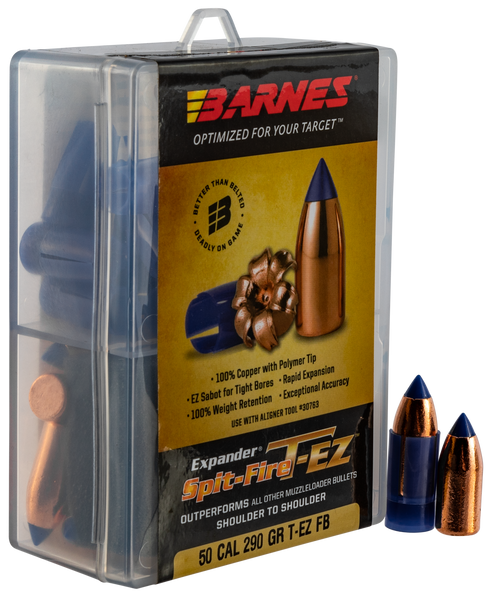 Barnes spit-fire t-ez muzzleloader bullets load easily, even in tight or fouled bores.The sabot design reduces the ramrod pressure required to load and seat these flat-base bullets.T-ez bullets deliver match-grade accuracy, like all barnes mz bullets.The 100% copper bullets feature a polymer tip that enhances expansion and boosts bc for superior long-range ballistics.They expand at both close and extended range, creating six razor-edge cutting petals...View more
