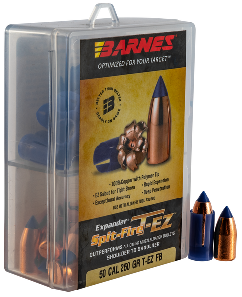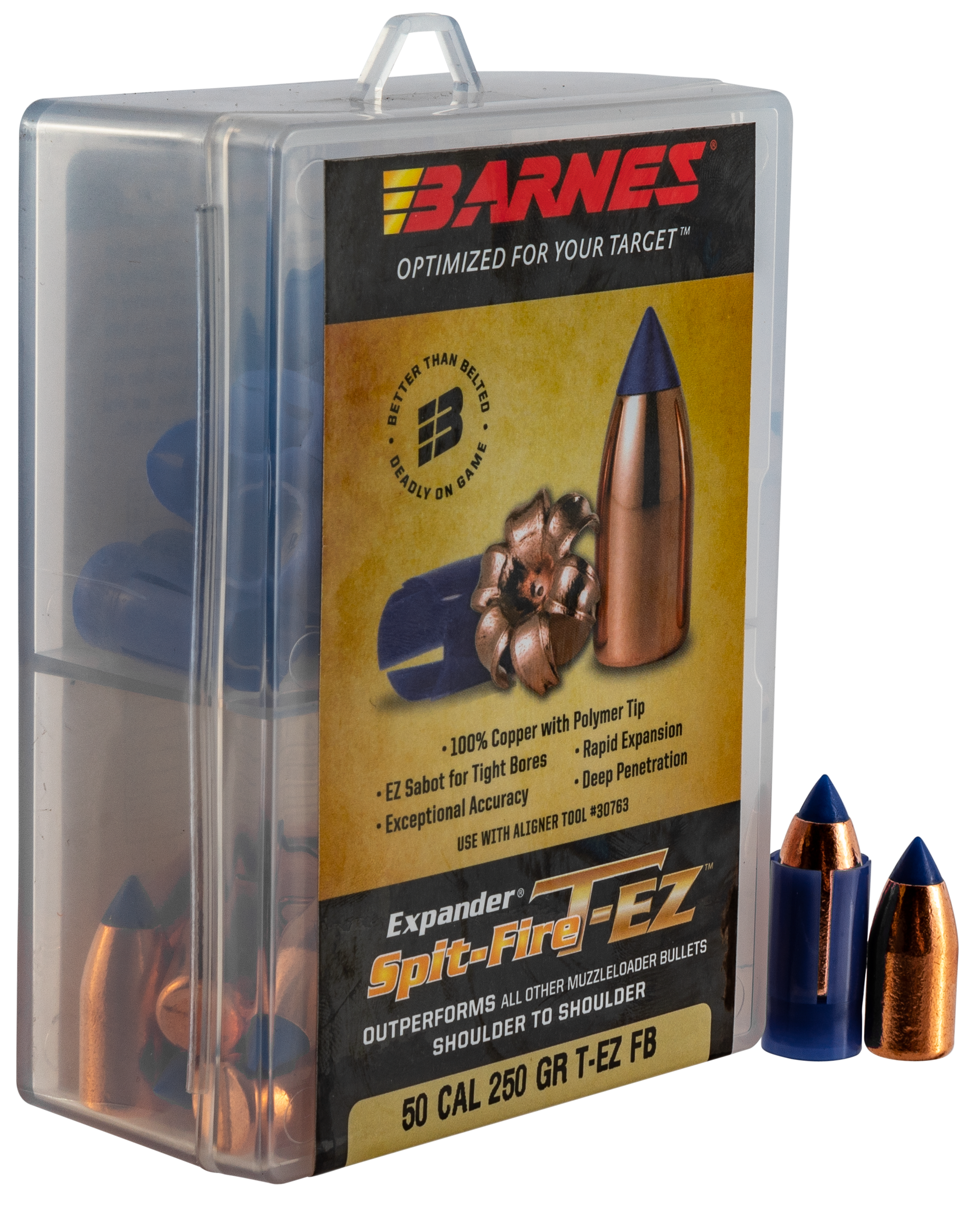 Barnes spit-fire t-ez muzzleloader bullets load easily, even in tight or fouled bores.The sabot design reduces the ramrod pressure required to load and seat these flat-base bullets.T-ez bullets deliver match-grade accuracy, like all barnes mz bullets.The 100% copper bullets feature a polymer tip that enhances expansion and boosts bc for superior long-range ballistics.They expand at both close and extended range, creating six razor-edge cutting petals...View more