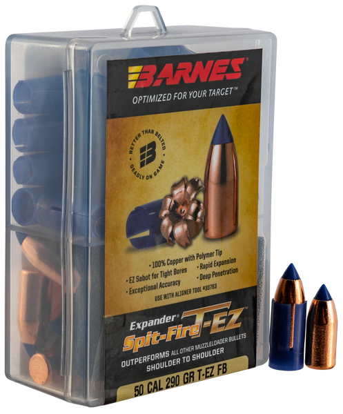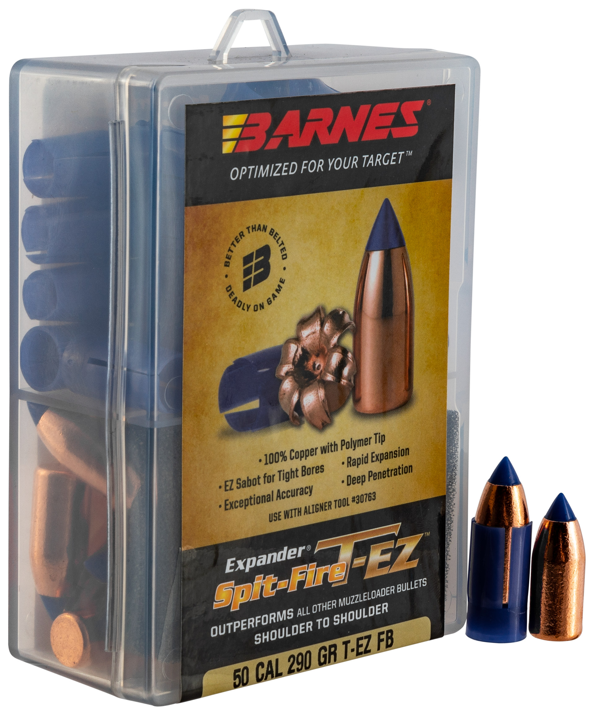 Barnes spit-fire t-ez muzzleloader bullets load easily, even in tight or fouled bores.The sabot design reduces the ramrod pressure required to load and seat these flat-base bullets.T-ez bullets deliver match-grade accuracy, like all barnes mz bullets.The 100% copper bullets feature a polymer tip that enhances expansion and boosts bc for superior long-range ballistics.They expand at both close and extended range, creating six razor-edge cutting petals that maximize shock and penetration.
