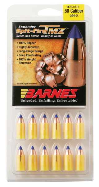 Barnes spit-fire t-ez muzzleloader bullets load easily, even in tight or fouled bores.The sabot design reduces the ramrod pressure required to load and seat these flat-base bullets.T-ez bullets deliver match-grade accuracy, like all barnes mz bullets.The 100% copper bullets feature a polymer tip that enhances expansion and boosts bc for superior long-range ballistics.They expand at both close and extended range, creating six razor-edge cutting petals that maximize shock and penetration.