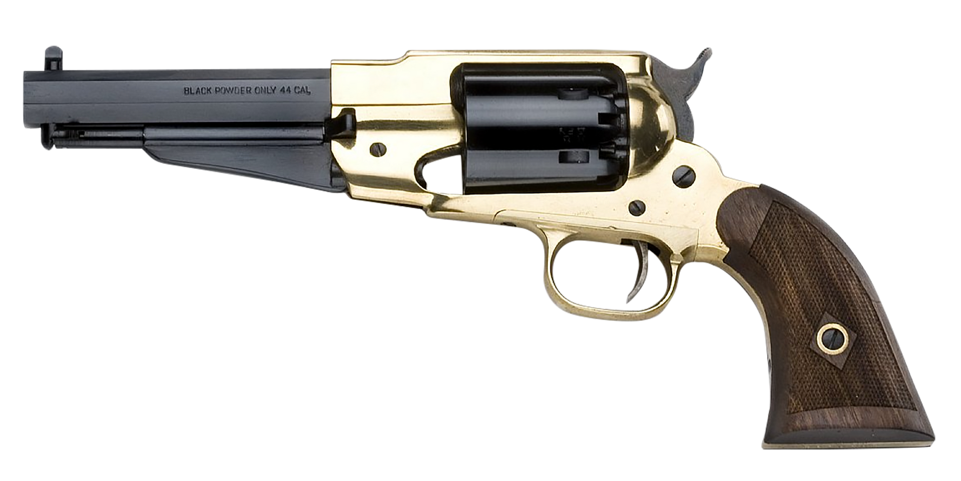The 1858 rem texas sheriff features a brass frame, octagon barrel, walnut grip, and blued finish barrel and cylinder.