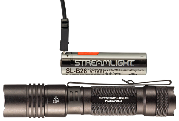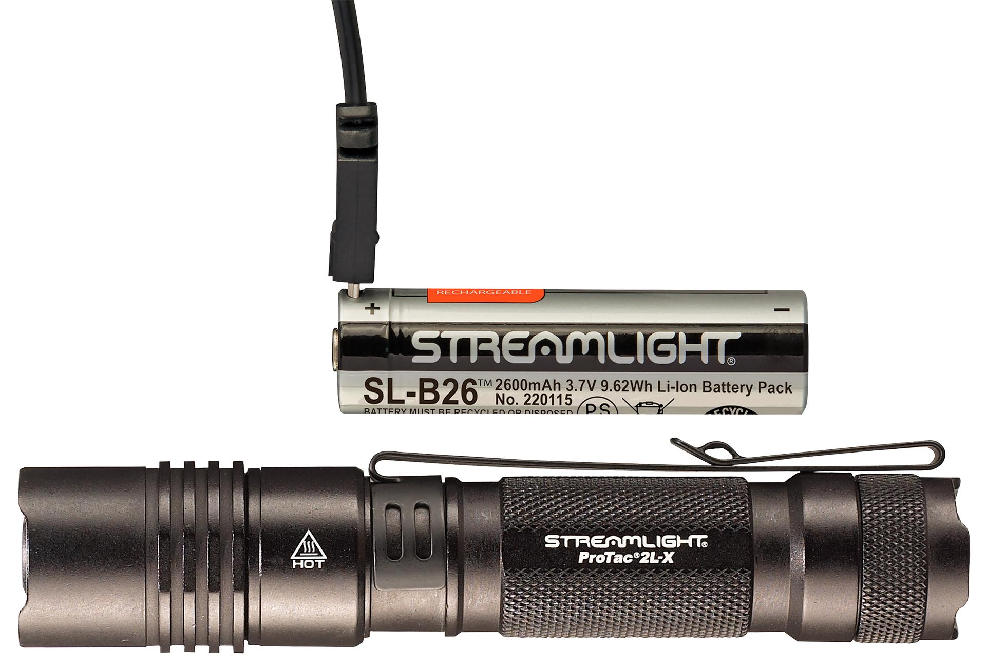 The protac 2l-x usb is a 500 lumen edc tactical lights that can use either a proprietary streamlight sl-b26 protected li-ion usb rechargeable battery pack or two cr123a disposable batteries.The protac 2l-x usb is a completely rechargeable system that comes with a charge cord and sl-b26 protected li-ion usb rechargeable battery pack.The protac 2l-x usb light features a tactical tail cap switch for momentary or constant on operation, three different user selectable programs and a pocket clip for convenience.The aluminum housing with type ii military spec anodizing helps make the lights extremely durable and abrasion resistant.Packaged with a removable pocket clip and holster.