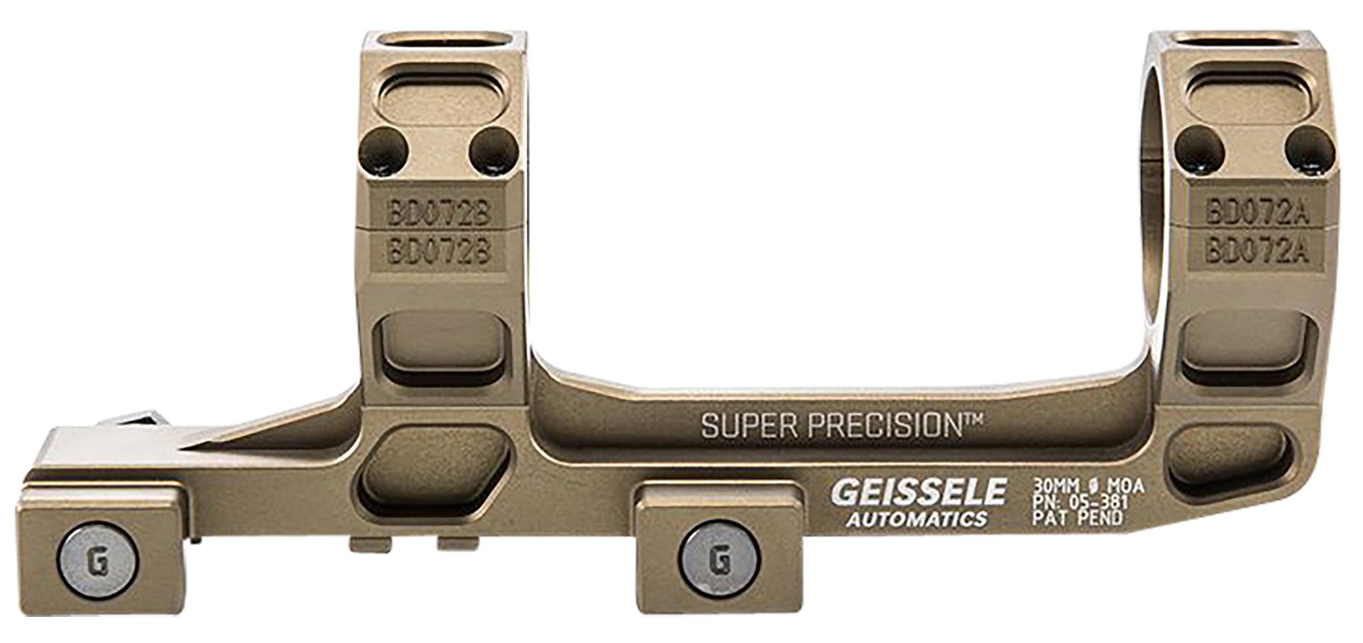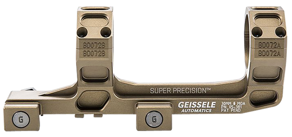 The ar-15/m4 super precision series of scope mounts are optimized for use with an ar-15/m4 upper.The mounting surface spans 7 picatinny sections and utilizes 4 shear lugs.These mounts use geisseles update of the classic nut and bolt method for clamping the mount to the picatinny rail, which is the most secure method of attaching your scope to your weapon.Each nut and bolt combination provides 1,400 pounds of clamping force, much more than any lever mounting arrangement.The geissele super precision mounts are made from 7075-t6 high strength aluminum.To create a mount with the best possible return to zero we machine the entire mount from a single piece of billet aluminum.This allows us to add pockets and ribs throughout the mount for added strength and rigidity.It allows us to line bore the caps to each another and then serialize the caps to the body.The line bore operation creates the best possible fit to the body of your scope so that you can apply proper torque without fear of crushing or damaging the body of your scope.Another advantage of machining from a single piece of aluminum is that we are able to create a mount with cap locations that will suit a wide variety of scopes.