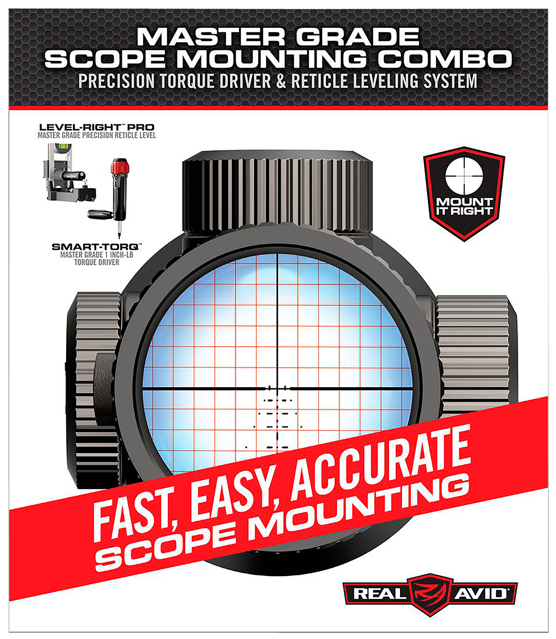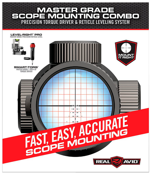 Avid master grade scope mounting combo contains a precision torque driver and reticle leveling system.