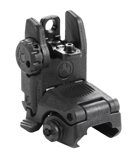 The mbus (magpul back-up sight) is a low-cost, color injection molded, folding back-up sight.The dual aperture mbus rear sight is adjustable for windage and fits most 1913 picatinny rail equipped weapons, but is specifically tailored to the ar15/m16 platform.Spring-loaded flip up sight easily activated from either side or by pressing the top release.Protective wings shield the dual, same plane flip apertures.Sight can still be folded with either large or small aperture in position.Detent knob easily and positively adjusts windage.0.7 moa (0.754"/100m) per click with a 14.5" sight radius.0.5 moa (0.547"/100m) per click with a 20" sight radius.Cannot be mounted to a railed gas block due to excess heat issues.Front mbus must be mounted to a railed fore end on the same plane as the receiver rail.Because of this the sight is also not compatible with moe hand guards.Made in the usa.