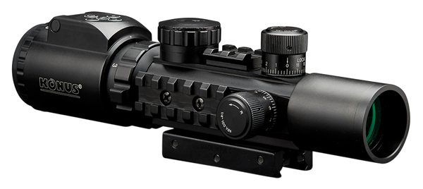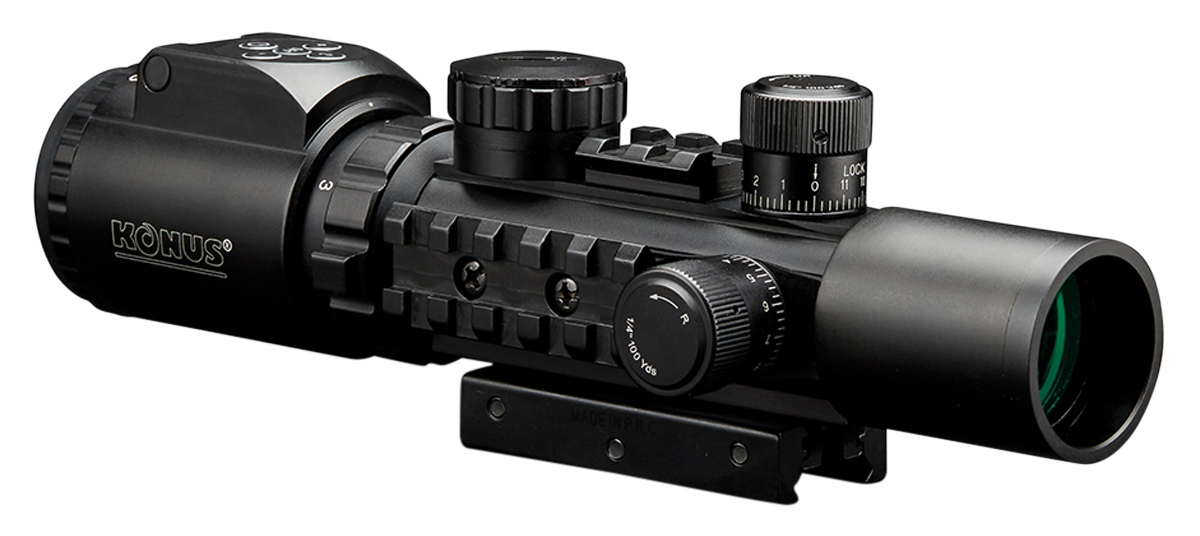 The konuspro as-34 electronic tactical scope has quick target acquiring properties, enhancing speed and accuracy at the range or in close quarter situations.The 34mm tube withstands extreme conditions and the integrated tri-rail system accepts all of your accessories.Features an wide angle, engraved dual illuminated red/green mil-dot reticle, illuminated level bubble, dual illuminator switch with 5 brightness settings; reversible base will fit weaver/picatinny and.22 rails; wide angle; locking tactical turrets and base is reversible and will fit both the weaver/picatinny and.22 rails.