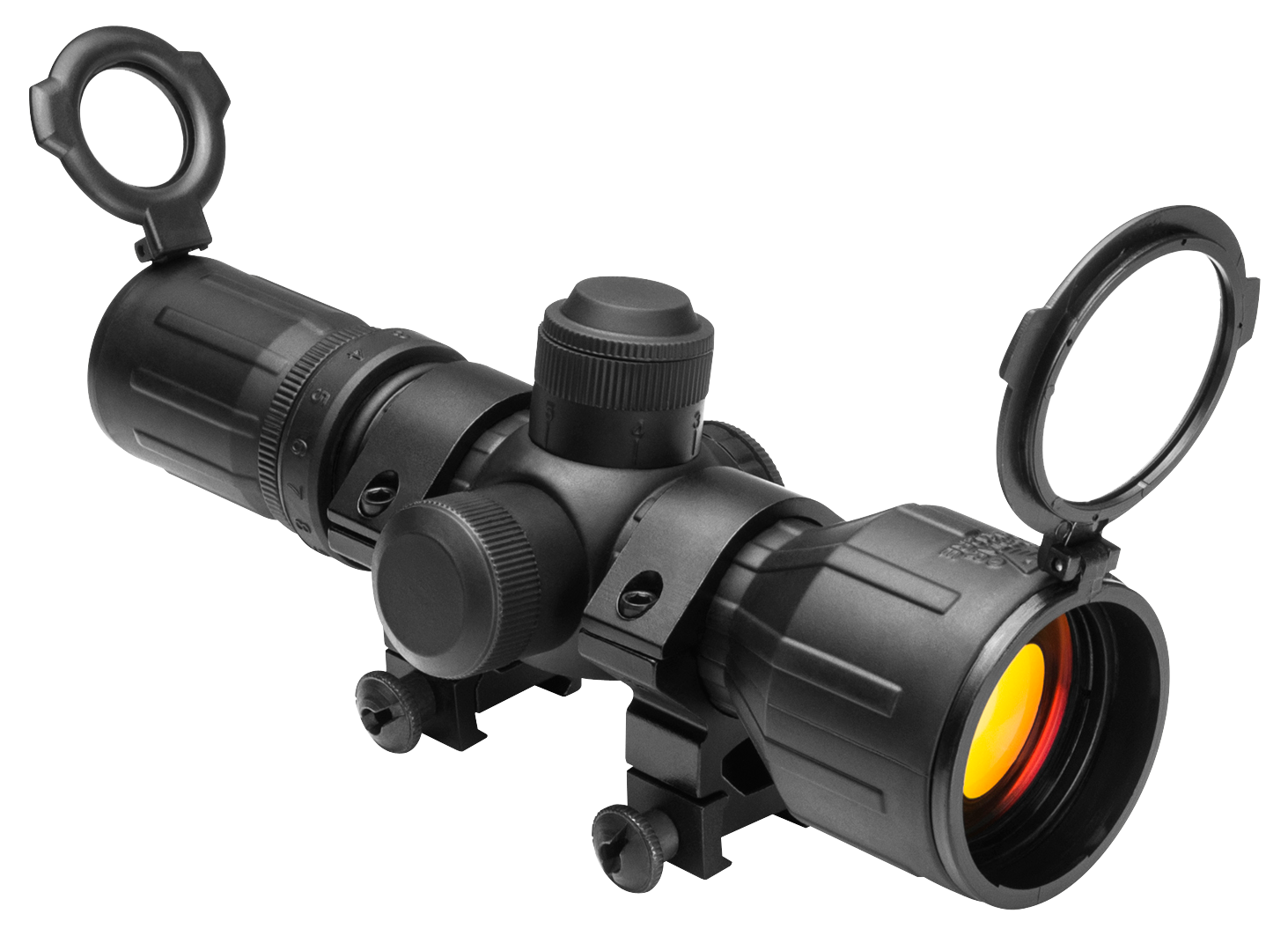 The compact rubber tactical scope provides strength and durability in any environment.Featuring a one-piece aluminum main tube with rubber outer coating, multi-coated lens, reticles illuminated in red and green with multiple brightness settings, lens covers and extra battery and built-in flip-up lens caps.